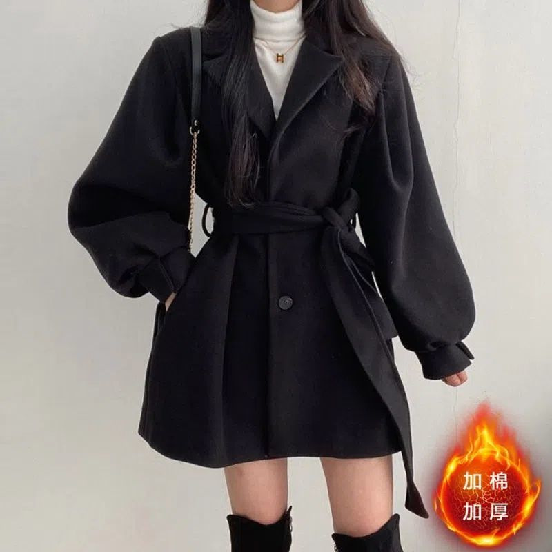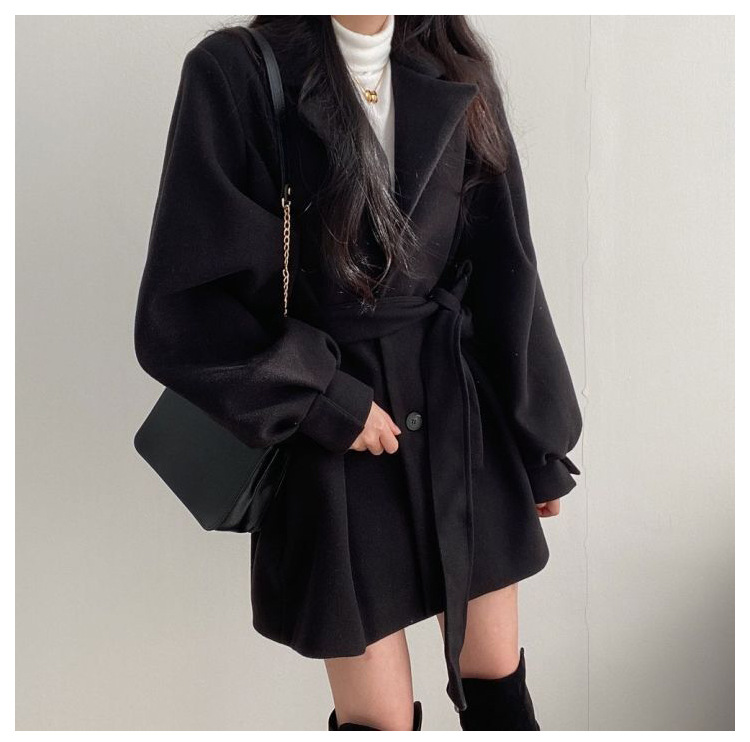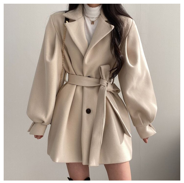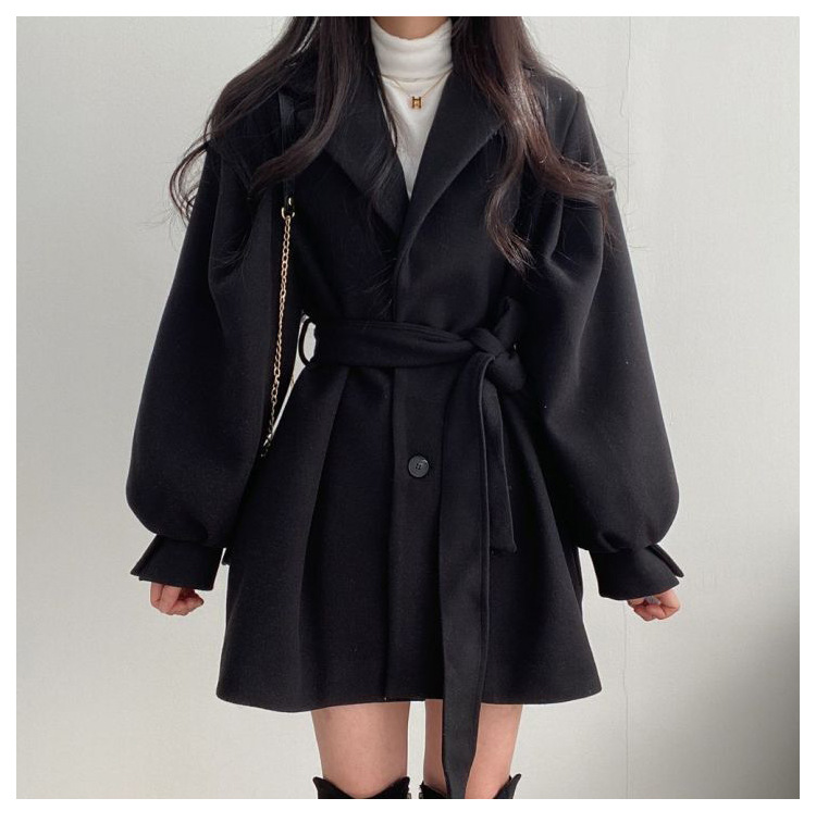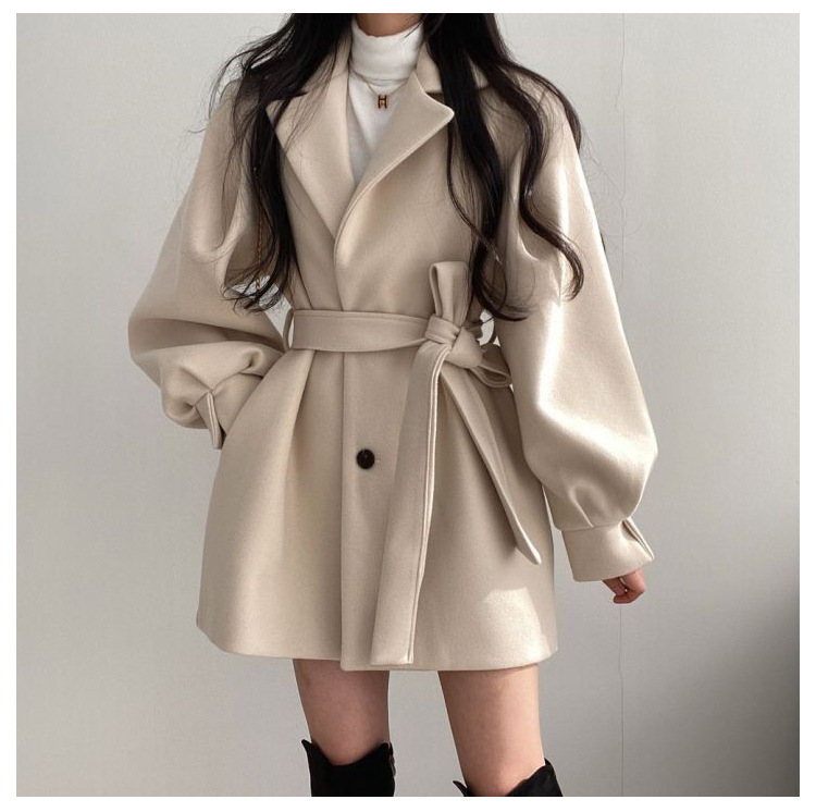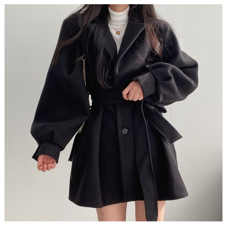 홍콩 스타일 가을, 겨울 의류 2025 복고풍 정장 코트 칼라 스트랩 허리 랜턴 슬리브 작은 모직 코트 여성용스토어 가기