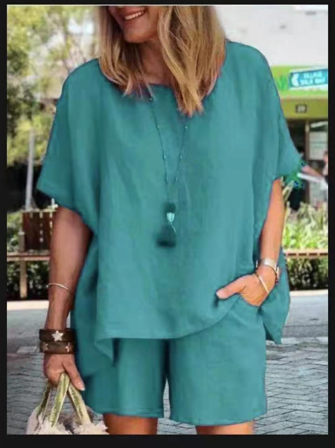 아마존 국경 2022 봄과 여름 새로운 세트 패션 기질 느슨한 짧은 소매 반바지면과 린넨 투피스 세트