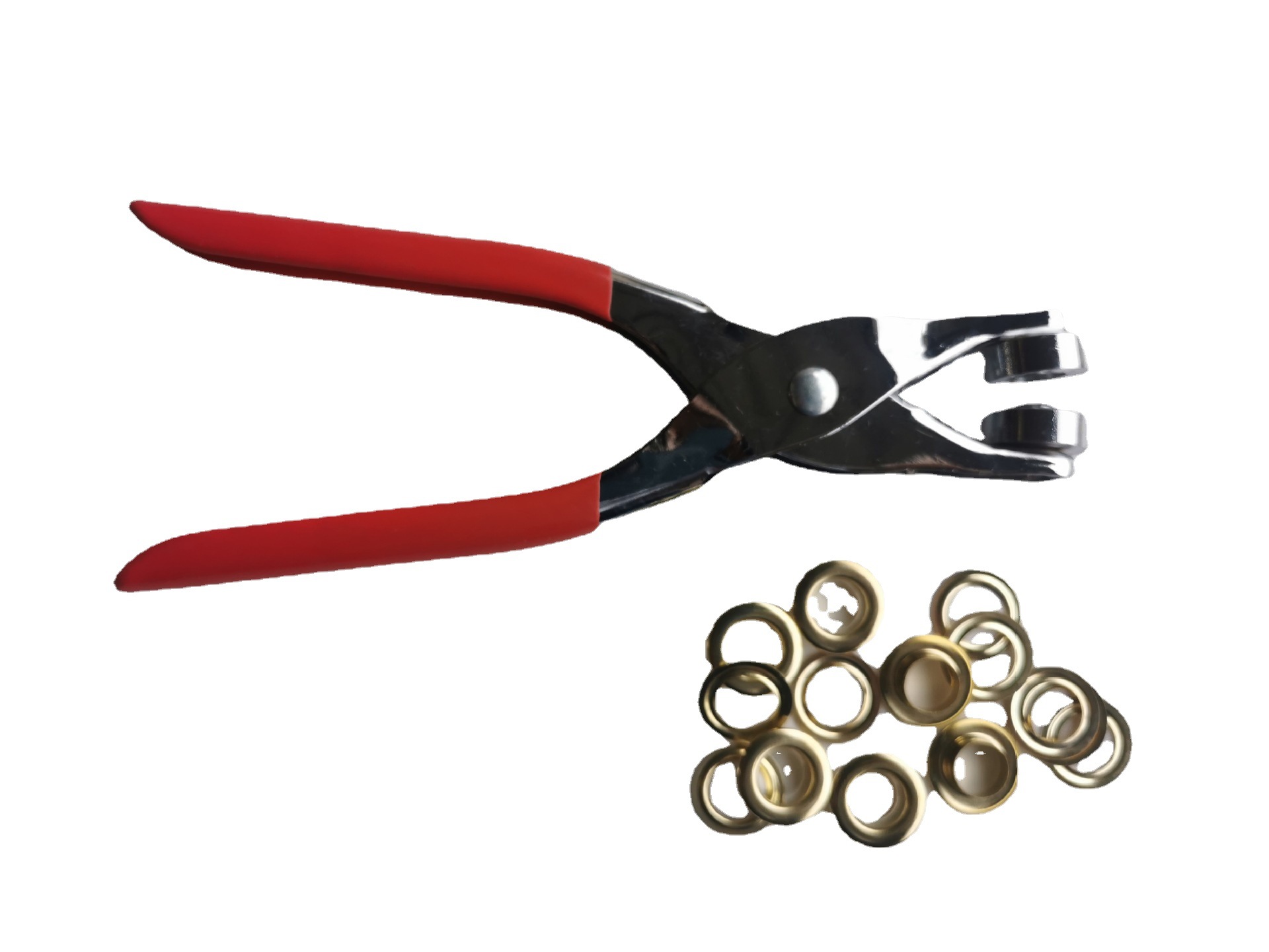 一般一套产品中自带一包10颗的铆钉,铆钉内径12mm,默认发货是配金黄色铆钉12mm气眼钳,铆钉钳,鸡眼钳