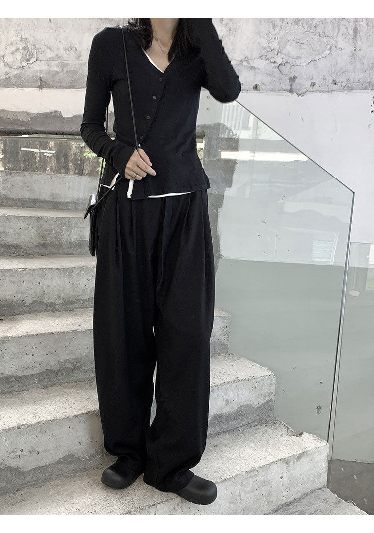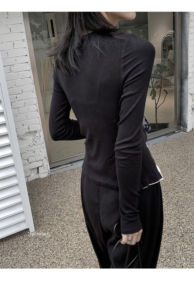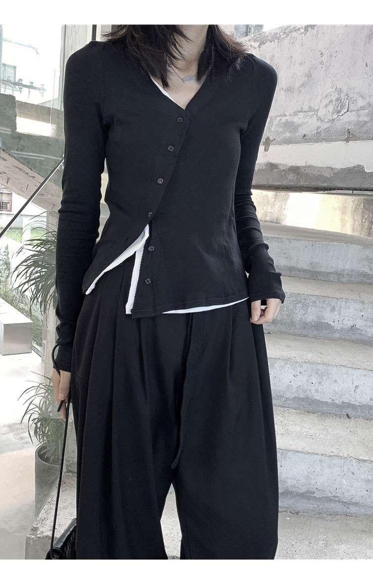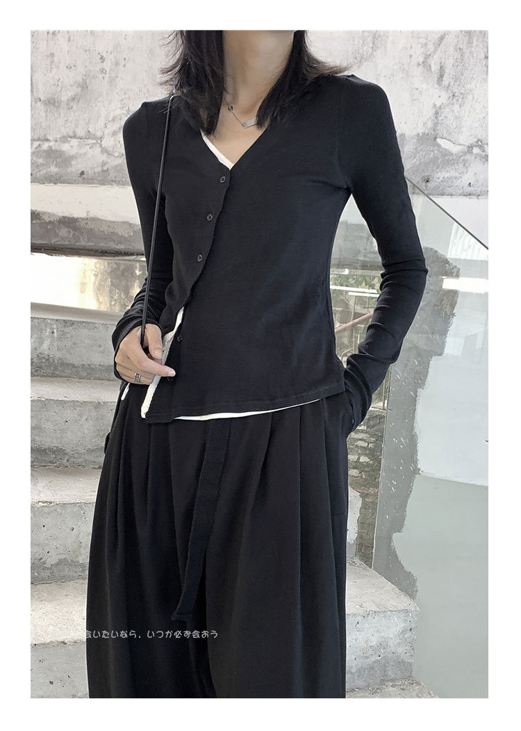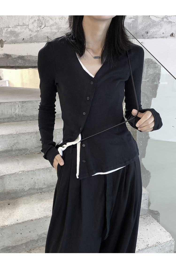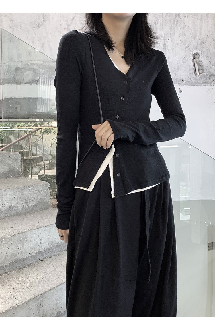 가을과 겨울 다크 페이크 투피스 디자인 니트웨어 여성용 V넥 슬림핏 슬리밍 베이스 셔츠 레이지 가디건 긴팔 티셔츠