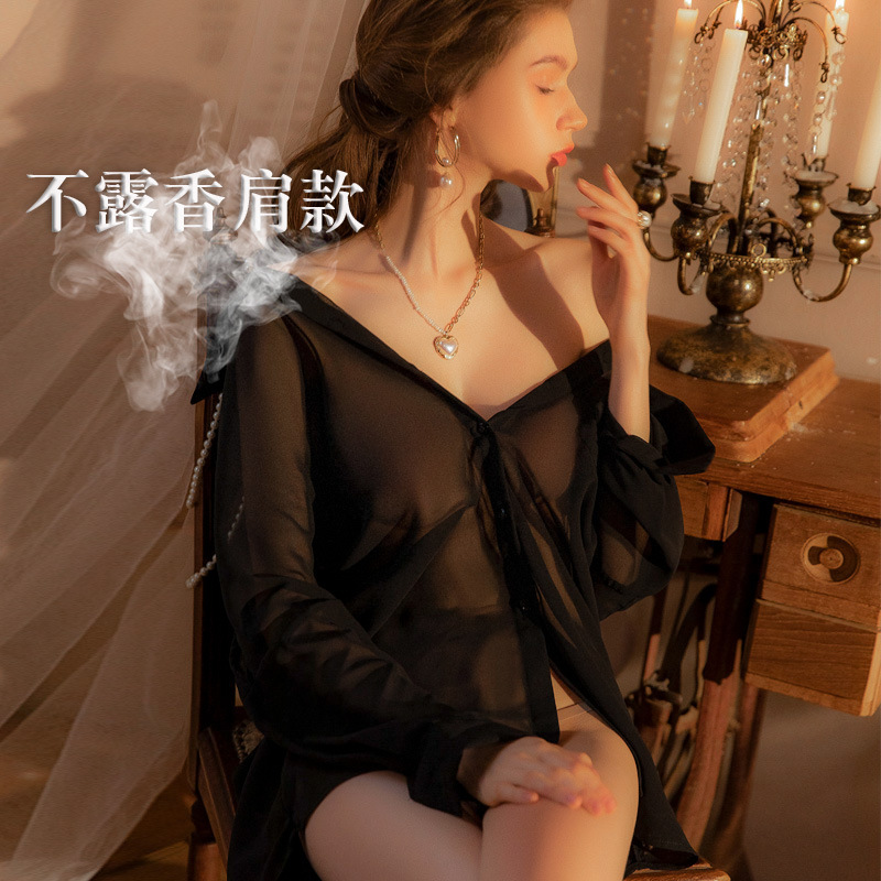 쉬폰 끈이없는 남자 친구 스타일 셔츠 여자의 섹시한 잠옷 투명 잠옷 짧은 플러스 사이즈 섹시한 속옷 긴 소매 9632스토어 가기