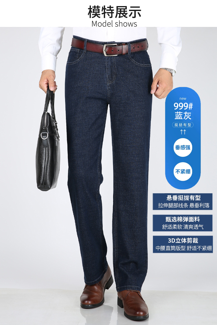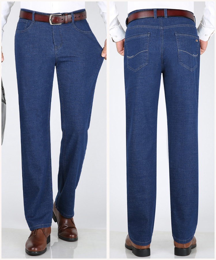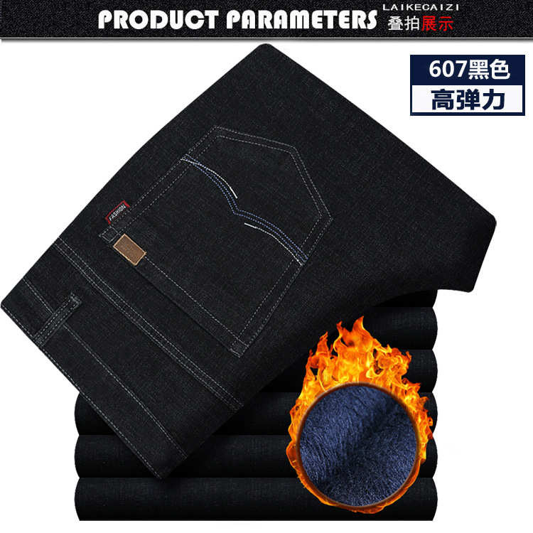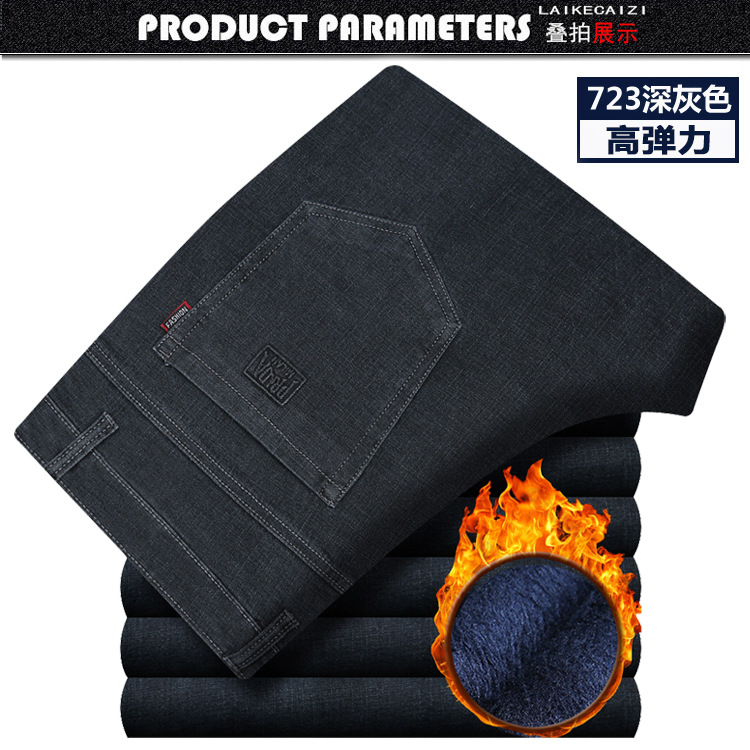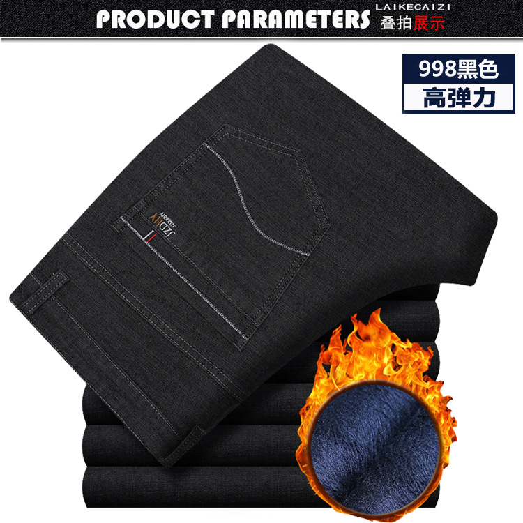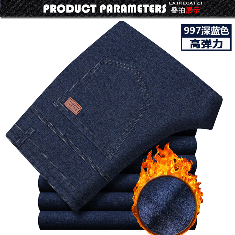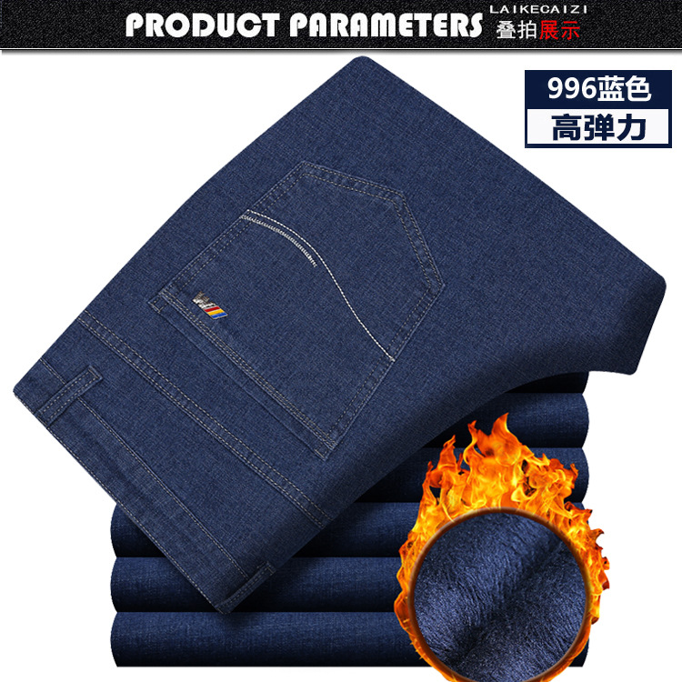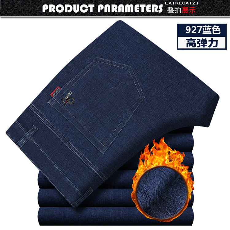 기모 두꺼운 청바지 남자의 느슨한 스트레이트 탄성 플러스 사이즈 따뜻한 양털 하이 웨이스트 겨울 바지 중년 및 노인 남성