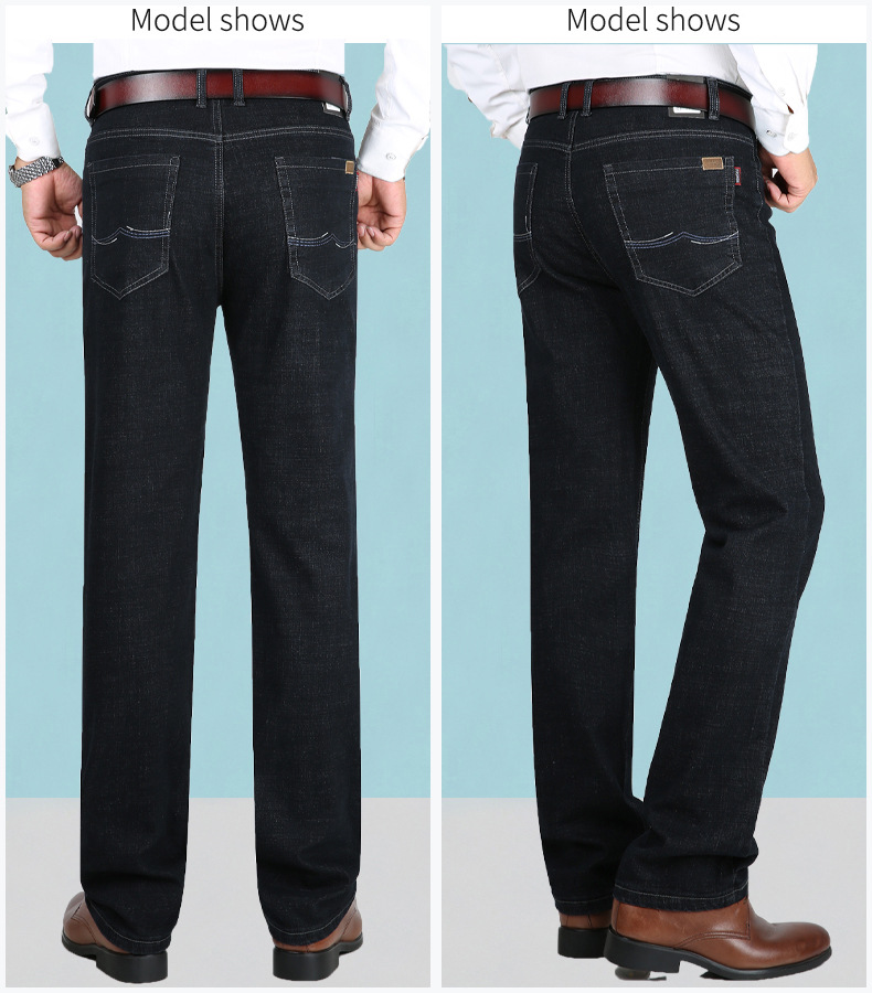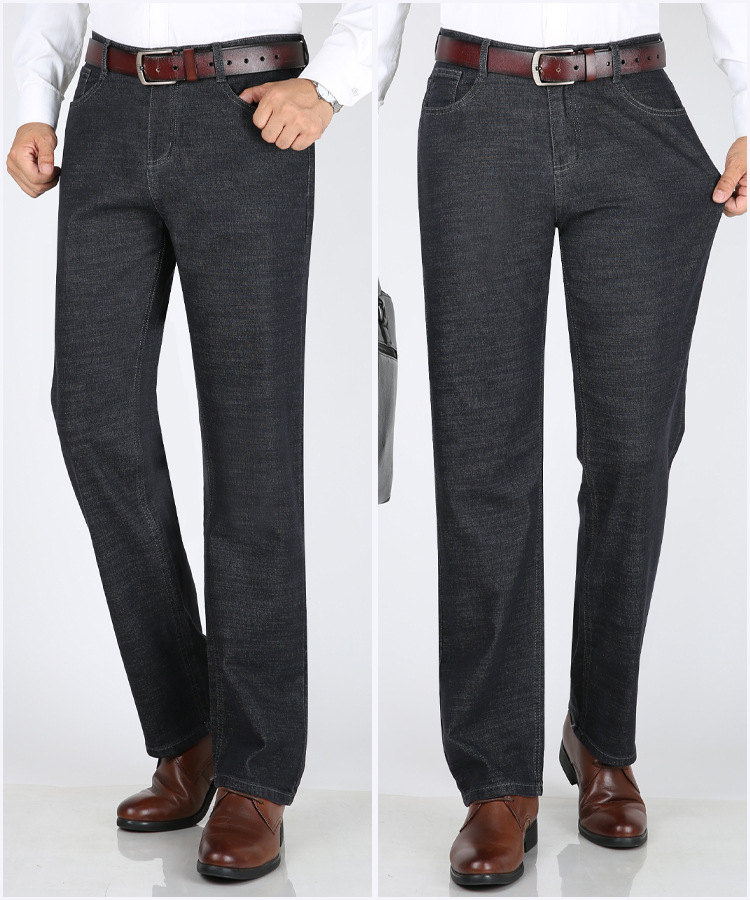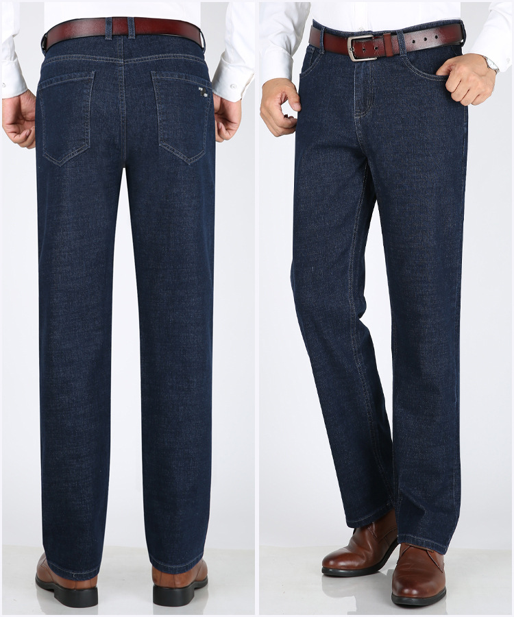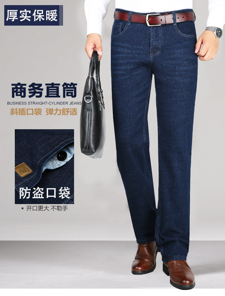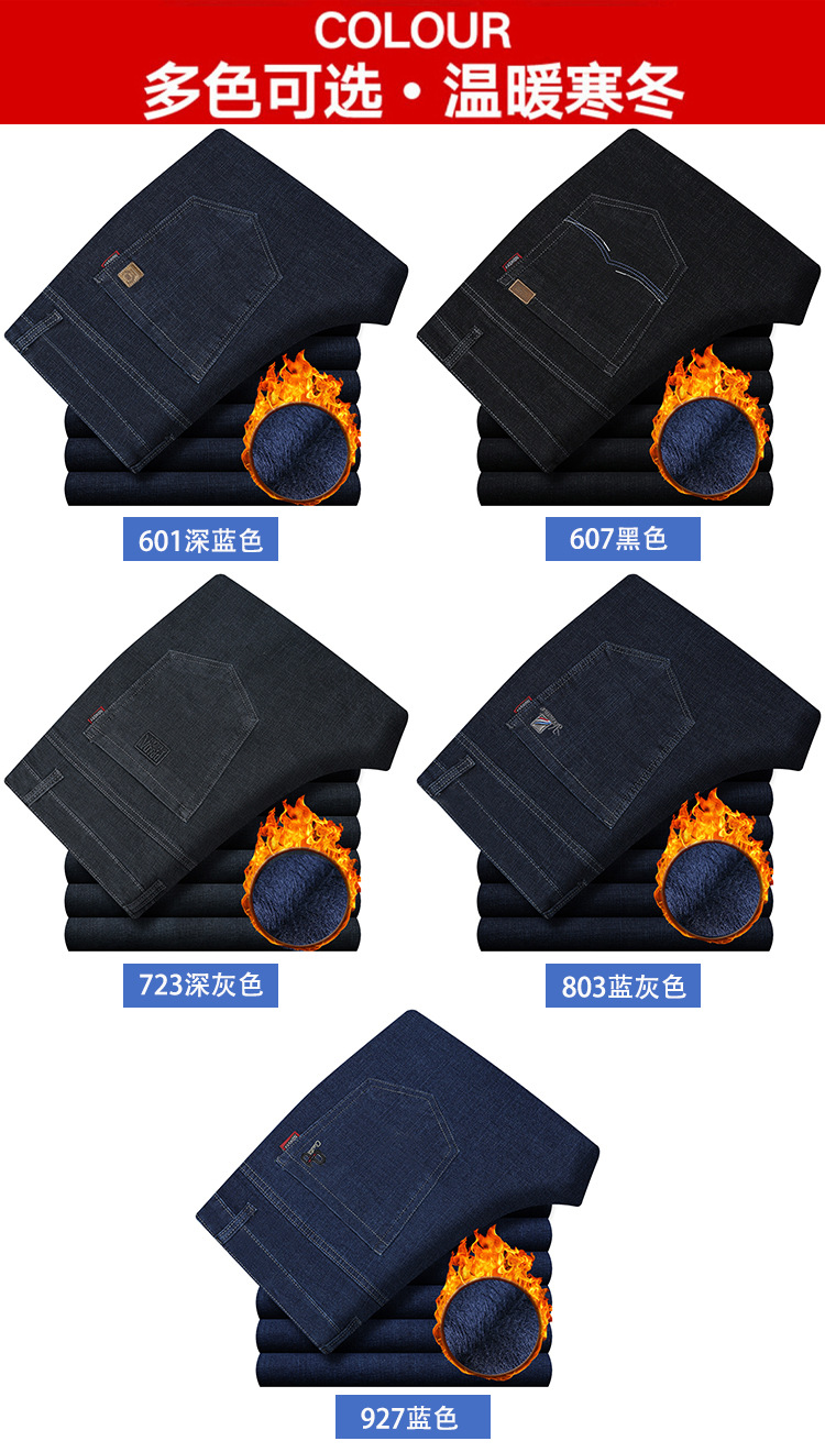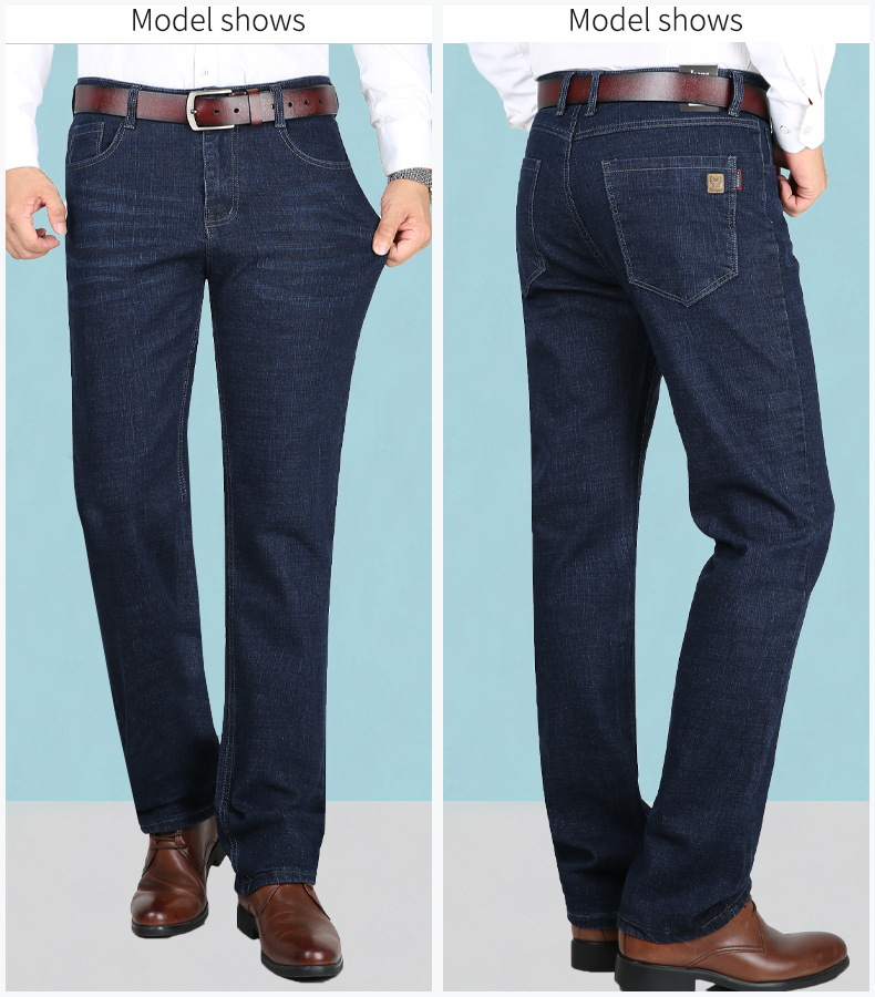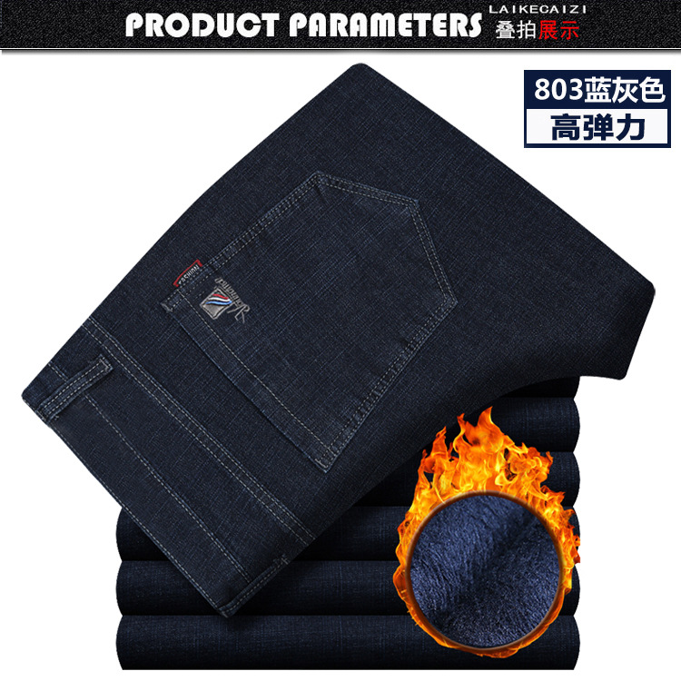 기모 두꺼운 청바지 남자의 느슨한 스트레이트 탄성 플러스 사이즈 따뜻한 양털 하이 웨이스트 겨울 바지 중년 및 노인 남성스토어 가기