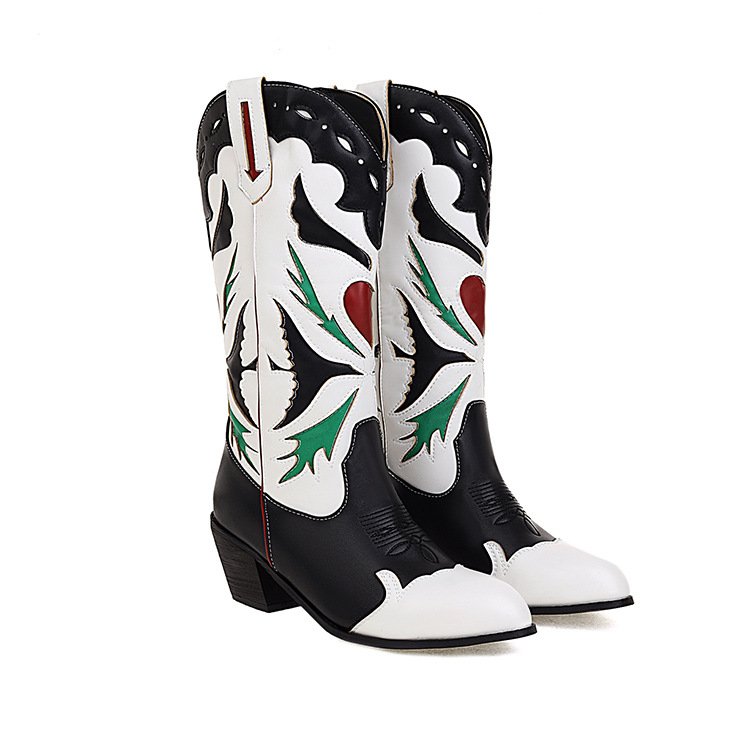 Wish 아마존 크로스 국경 대외 무역 플러스 사이즈 여성용 가죽 부츠 2021 새로운 자수 미들 부츠 여성용 로우 힐 컬러 매칭 부츠