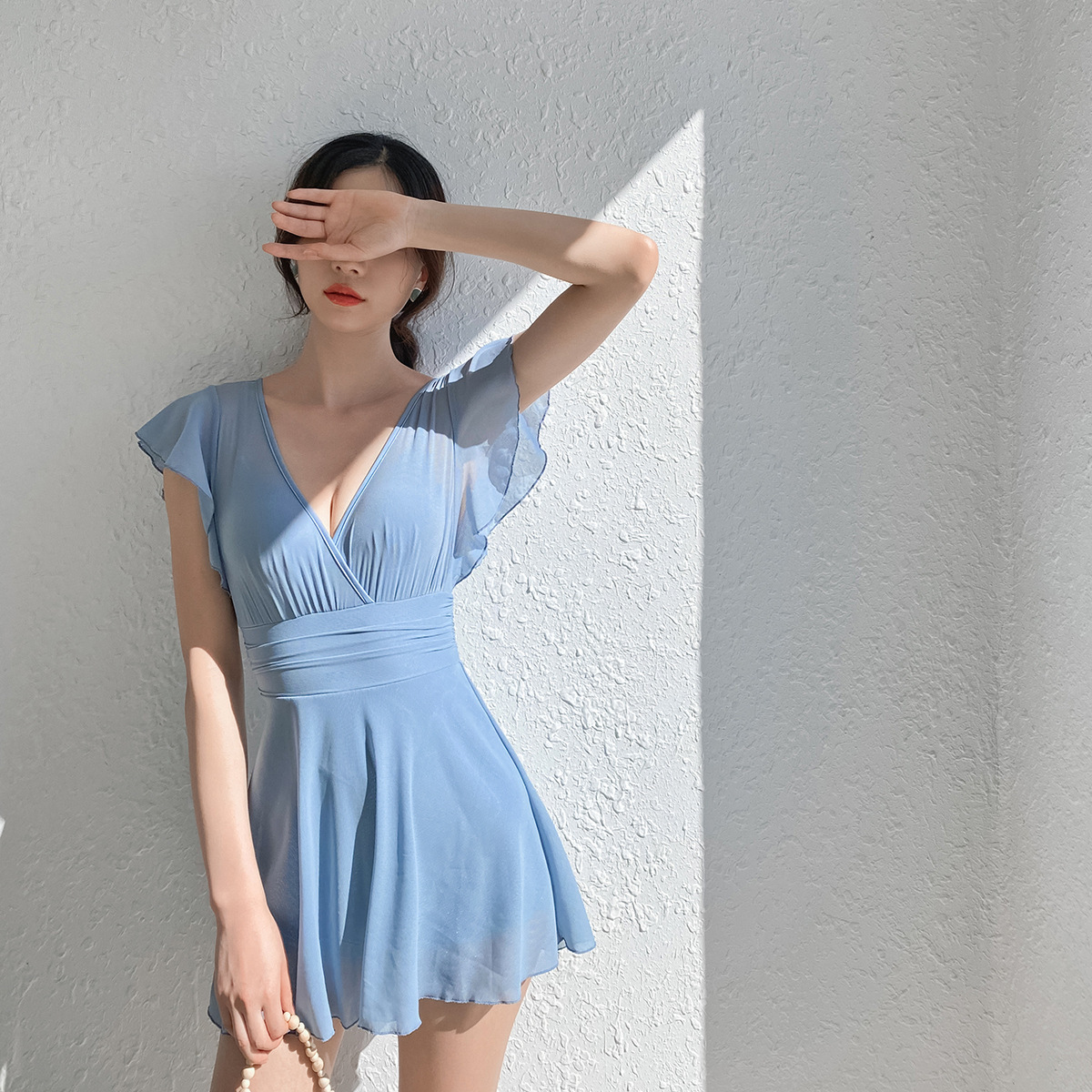 작은 가슴이 원피스 수영복 여성 슬리밍 배꼽 커버 요정 팬 보수적 인 온천 고기 커버 수영복 블랙 한국