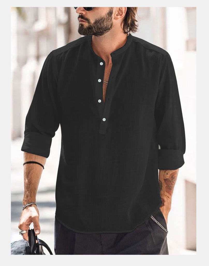 2025 새로운 유럽과 미국의 대외 무역 남성 캐주얼 스탠드 칼라 도어 튜브 솔리드 컬러 긴팔 셔츠 WISH 대나무면과 린넨 셔츠