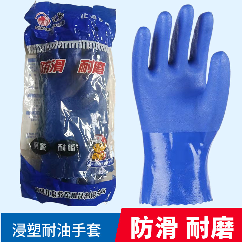 Jiangquan 블루 내유성 장갑 PVC 함침 플라스틱 젖빛 장갑 화학 미끄럼 방지 내마모성 노동 장갑 도매