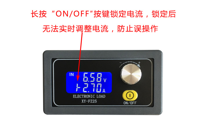 4. 在电流显示界面,长按”ON/OFF”按键用来开启或关闭数据锁功能,如果开启数据锁功能, 会在电流前面显示锁定符号“ I-”,此时无法通过旋转编码电位器实时调整负载电流,防止误操作;