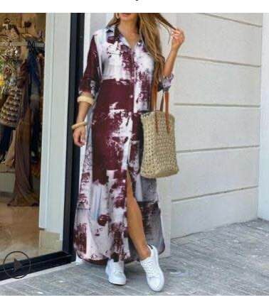 아마존 새로운 여성 의류 유럽과 미국 봄과 가을 패션 섹시한 싱글 브레스트 셔츠 긴 원피스 느슨한 옷깃 원피스스토어 가기