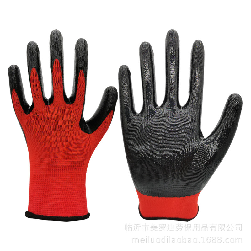 맞춤형 장갑 레드 원사 블랙 니트릴 내마모성 내유성 미끄럼 방지 나일론 손잡이 내구성 인쇄 처리 노동 보호 장갑스토어 가기