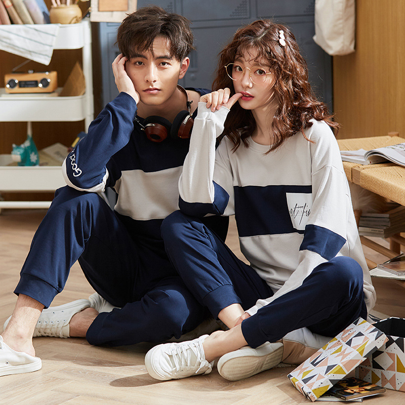 크로스-보더 커플 잠옷 여자의 봄과 가을 면 긴 소매 풀오버 캐주얼 크루넥 바지 남자의 아웃웨어 가정 의류 세트스토어 가기