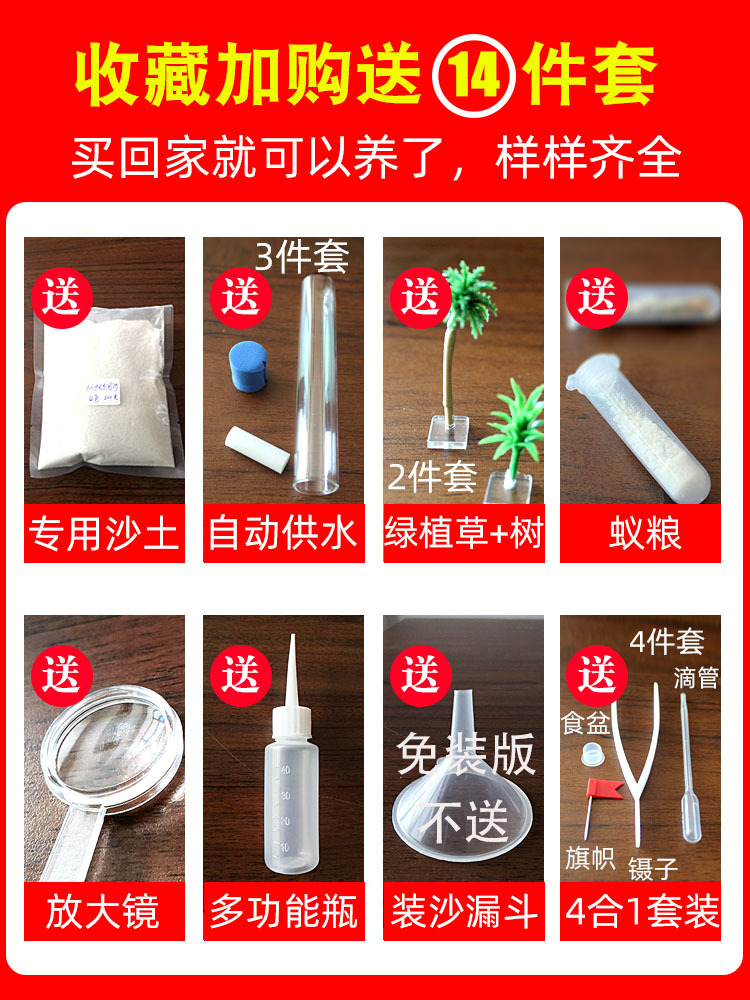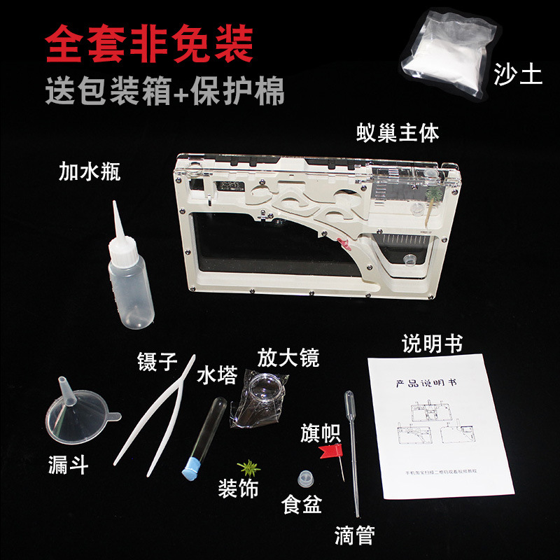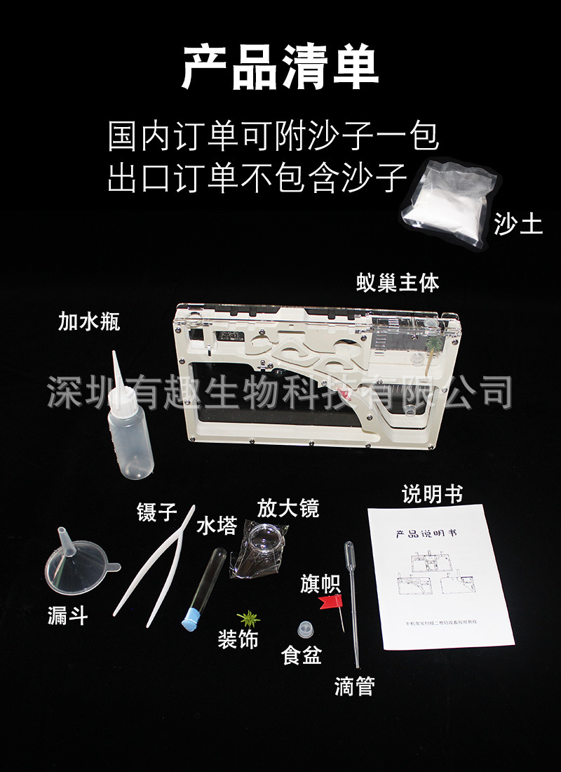 【清单】:蚁巢主体,加水瓶,镊子,放大镜,滴管,漏斗,水塔,旗帜,说明书,沙土。