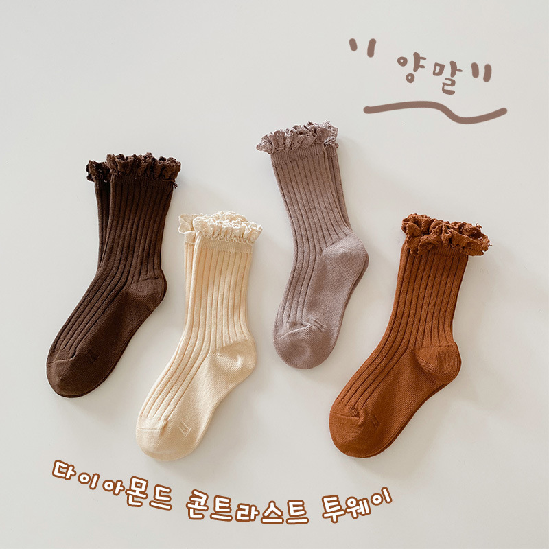 한국식 더블 바늘 소녀 레이스 양말 2024 봄과 가을 단색 줄무늬 귀여운 소녀 양말이 면화 어린이 중간 종아리 길이 양말스토어 가기