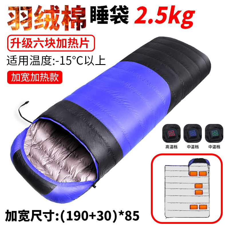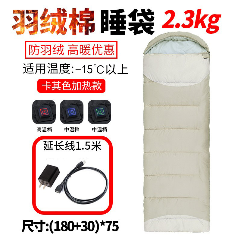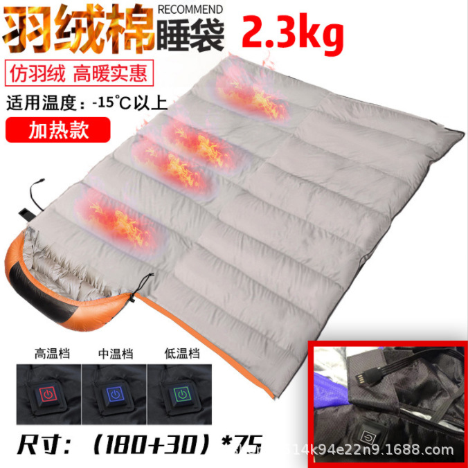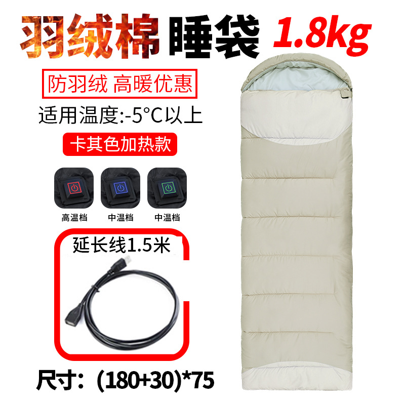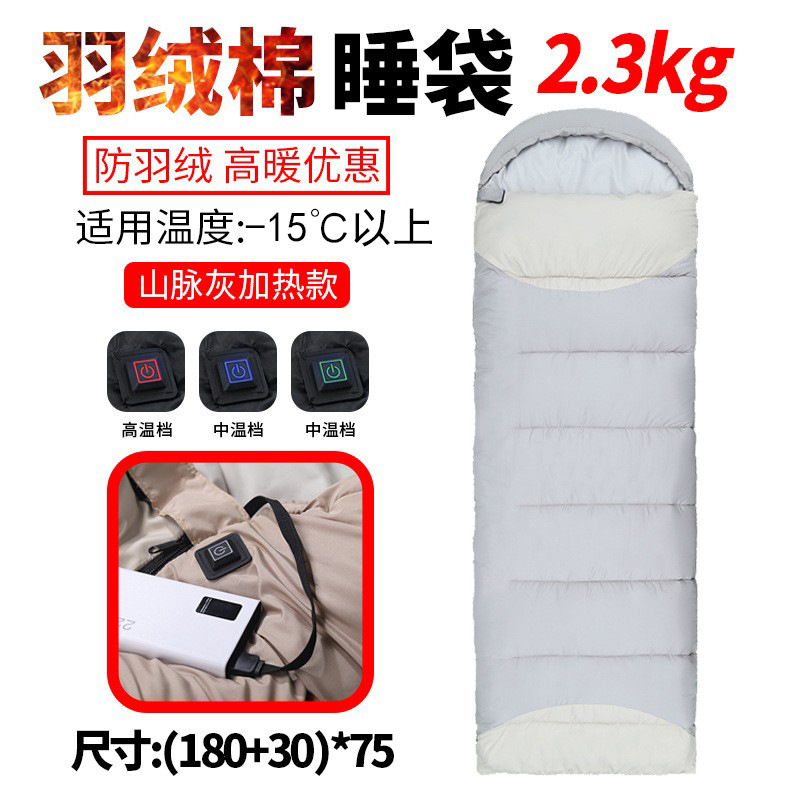 USB 가열 침낭 야외용 싱글 다운 침낭, 보조 배터리와 결합 가능, 보온 및 두꺼운 캠핑용 침낭