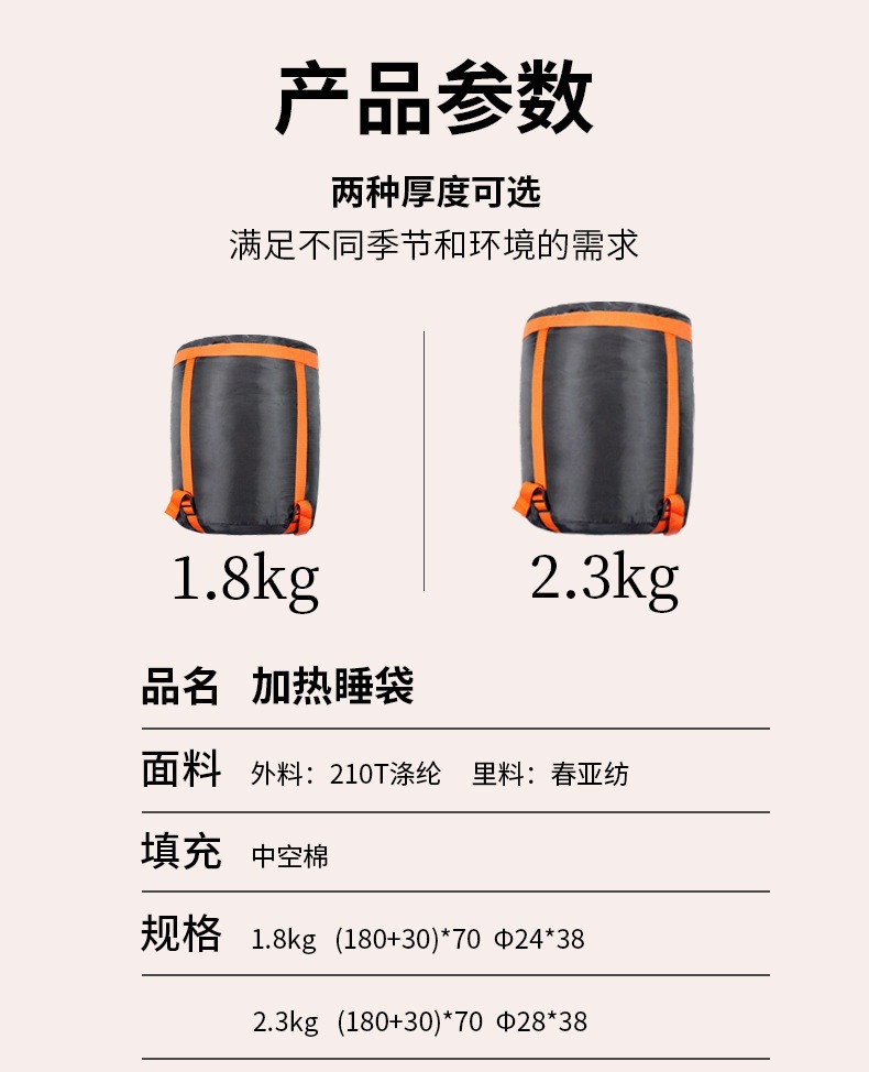 • 3kg 95cm 넓은 침낭 + 보관 가방 + 1.5m 케이블 + 충전 헤드 + 수면 베개