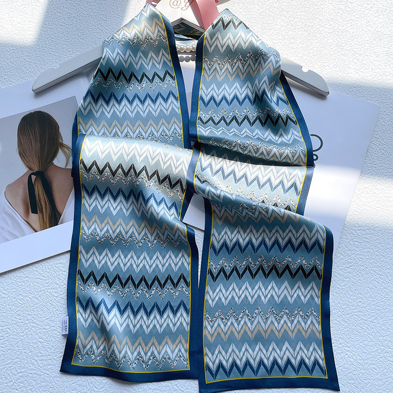 부드러운 색상 블루 물결 무늬 항저우 실크 뽕나무 실크 스카프 긴 리본 우아한 여성용 헤어 밴드 스카프