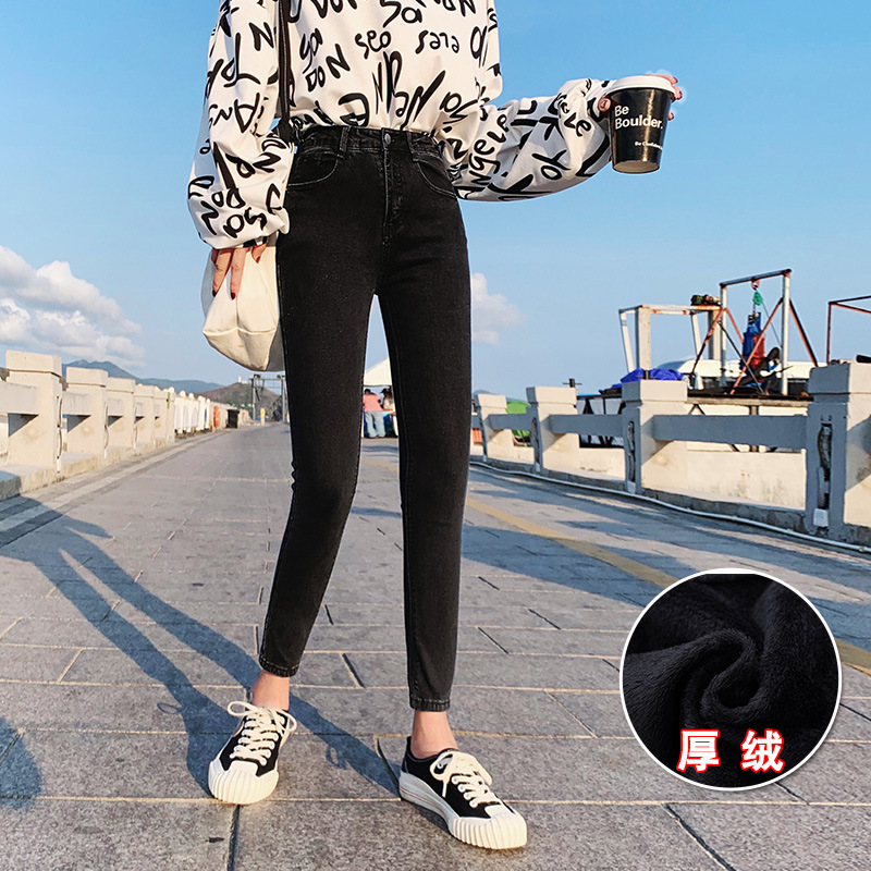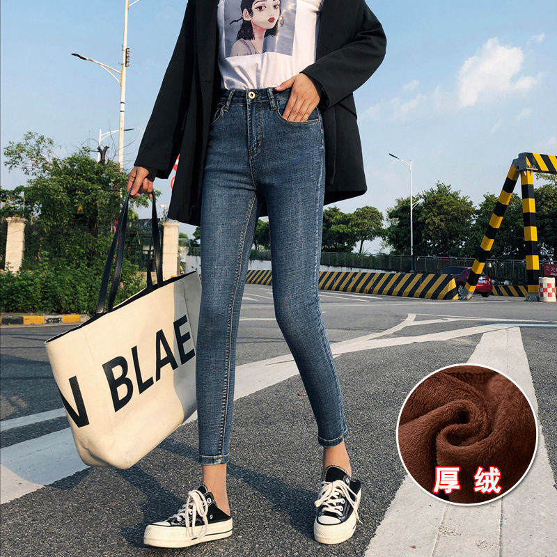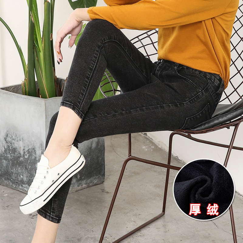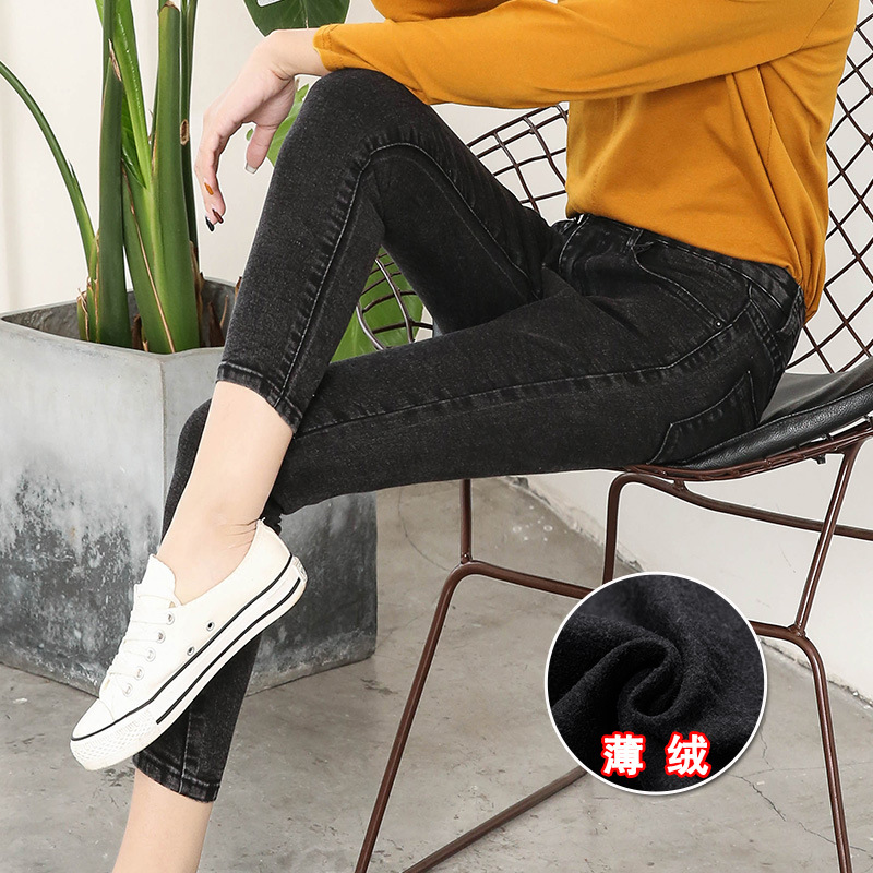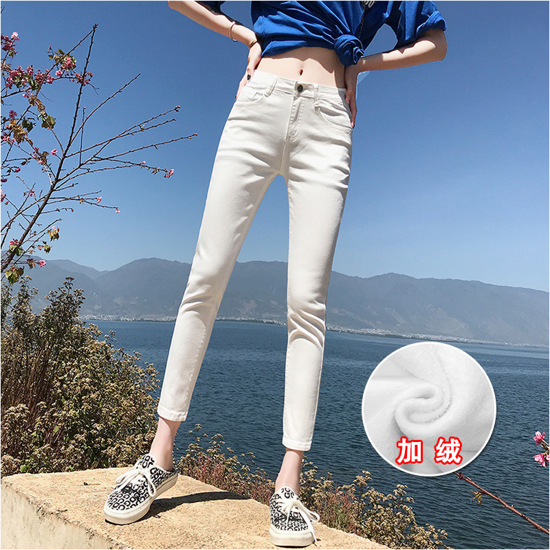 기모 화이트 크롭 청바지 여성의 두꺼운 가을과 겨울 하이 웨이스트 꽉 길게 자른 연필 바지스토어 가기