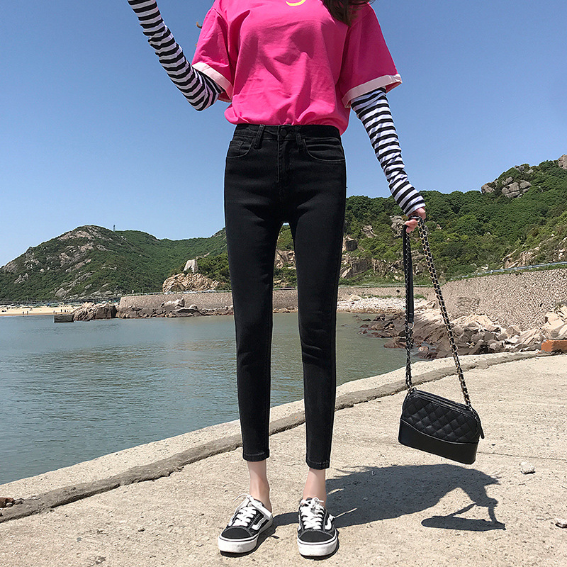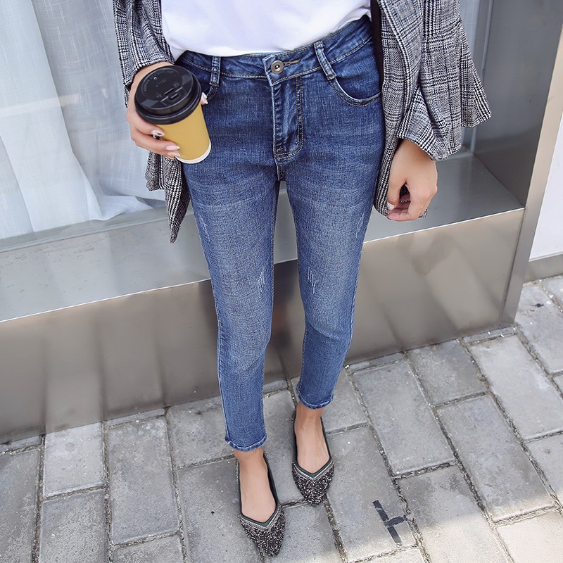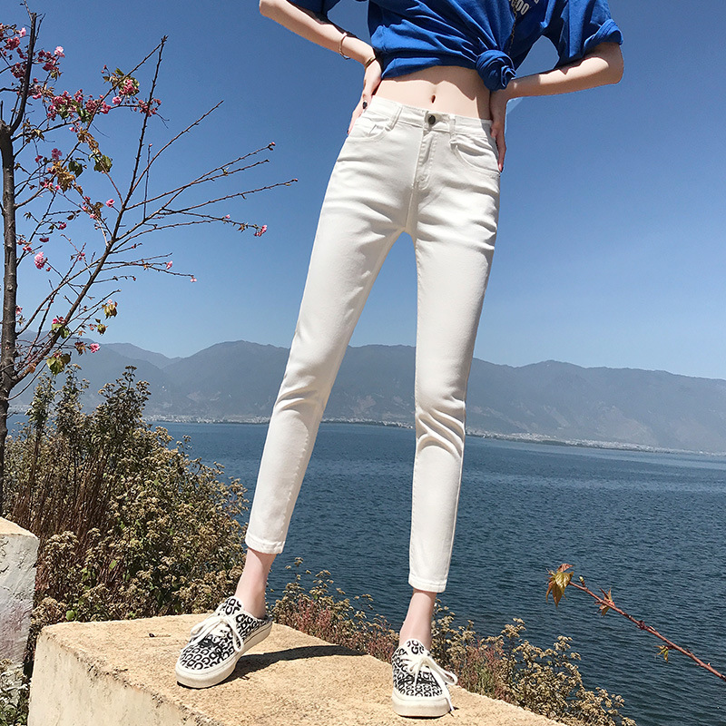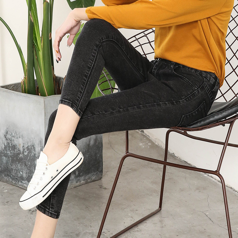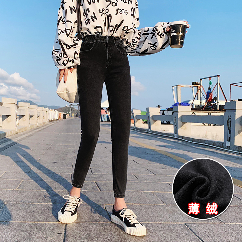 기모 화이트 크롭 청바지 여성의 두꺼운 가을과 겨울 하이 웨이스트 꽉 길게 자른 연필 바지스토어 가기