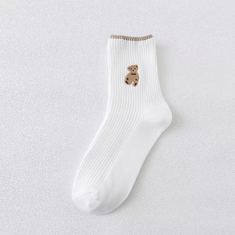 양말 여성의 가을과 겨울 폭발 더블 바늘 자수 곰 양말 중간 배럴 스트라이프 여성의면 양말 유행 일본 스택 양말