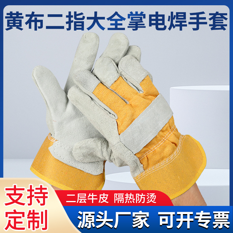 도매 용접기 장갑 노란색 천 두 손가락 손바닥 두꺼운 단열 보호 장갑 소가죽 용접 장갑