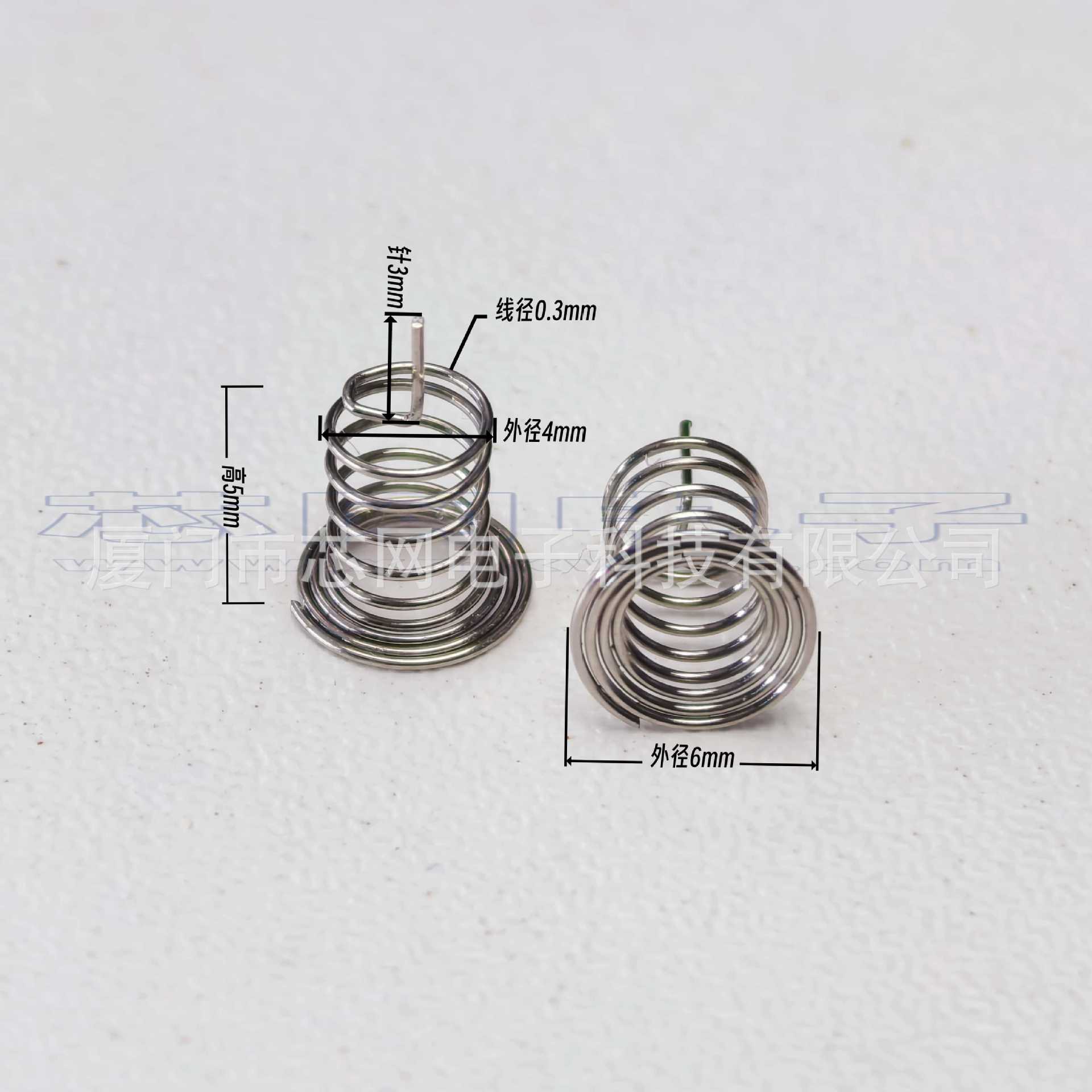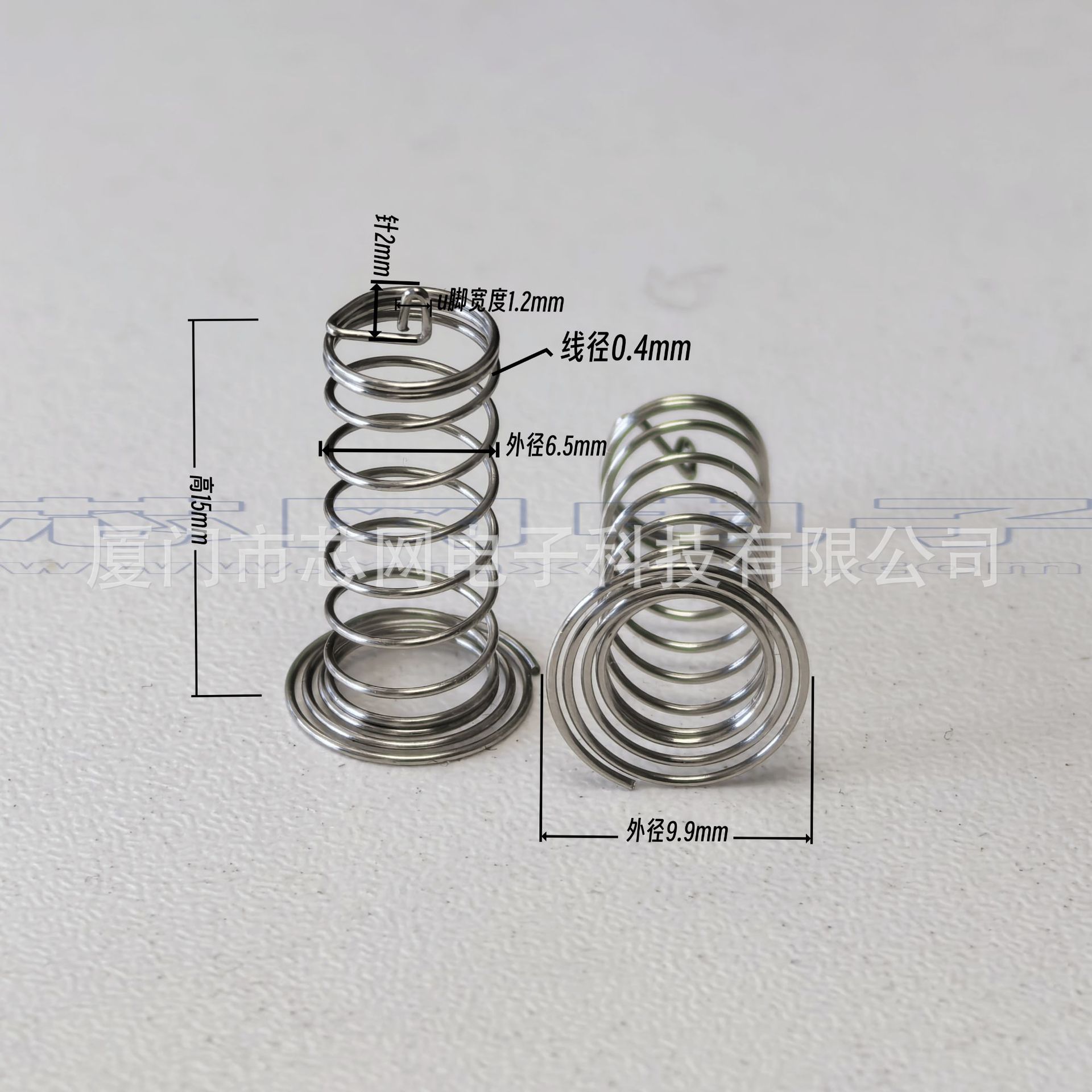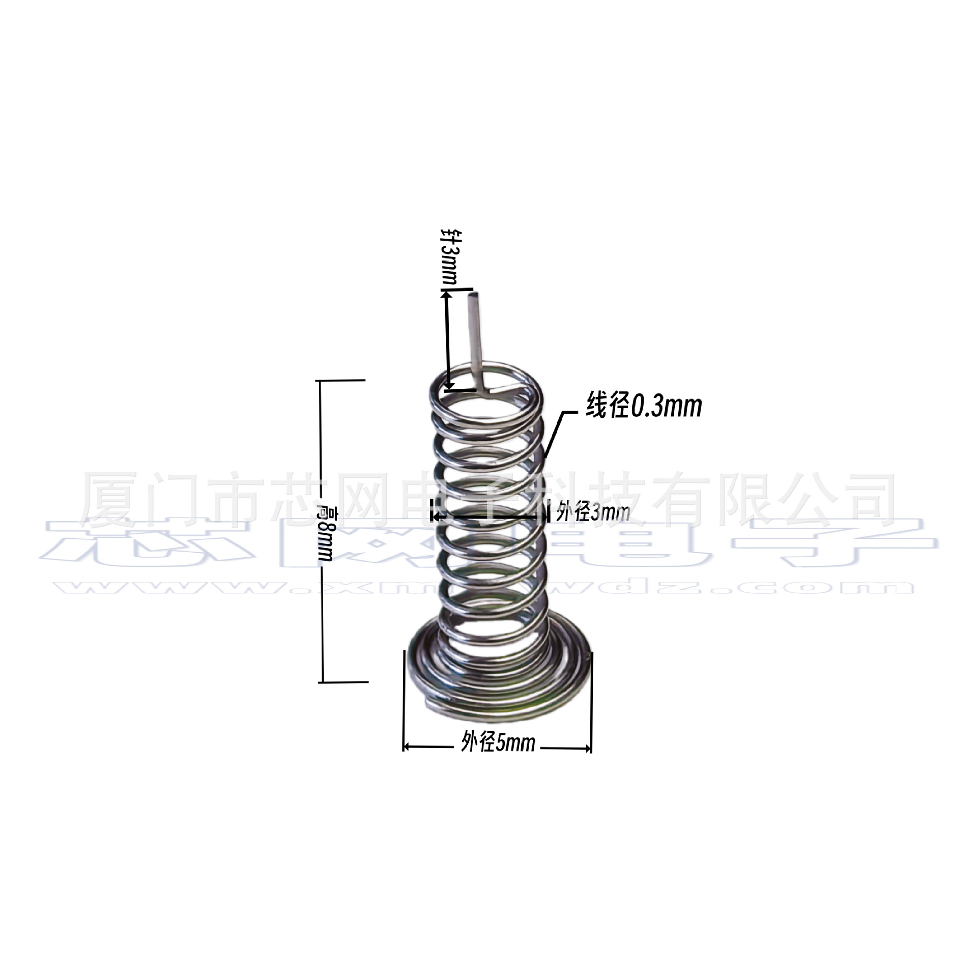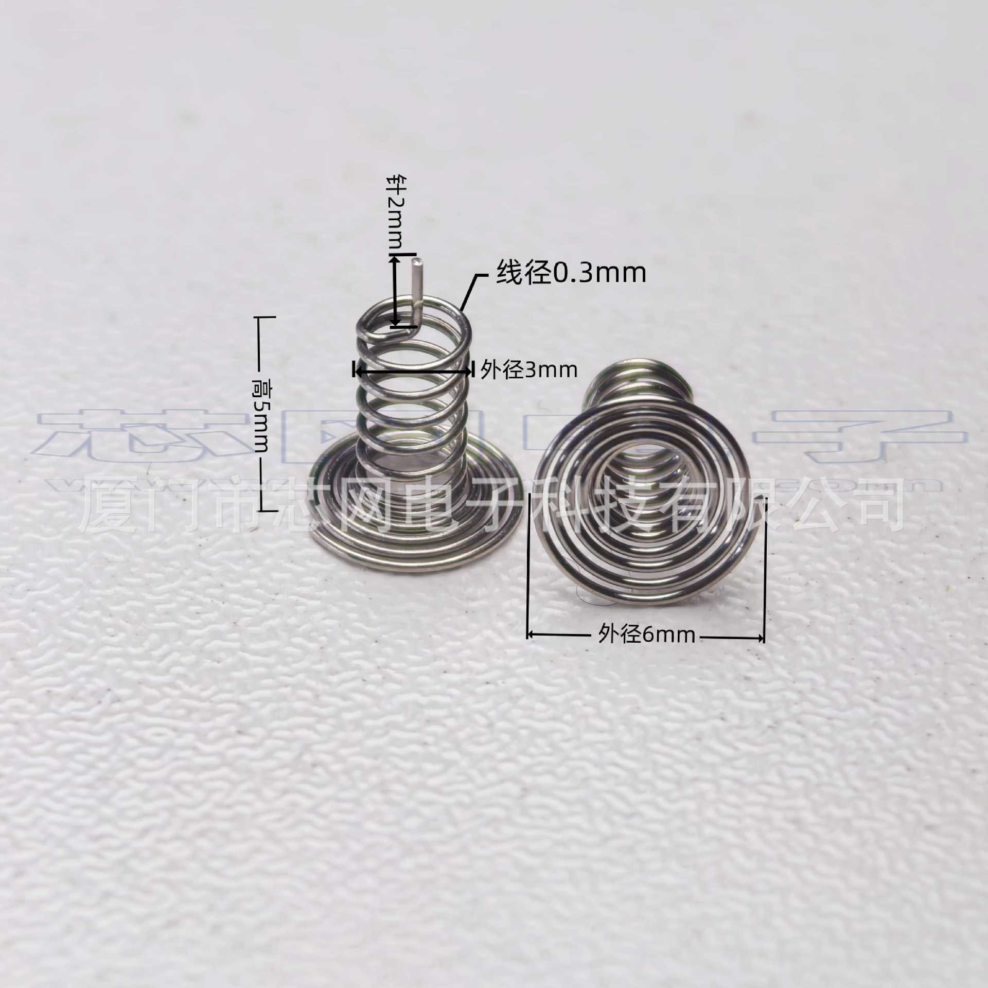 是指专用于电容式触摸芯片的专用弹簧按键。当小家电外壳跟pcba无法紧密贴合的时候,就需要通过导体来填补空间距离,目前主流应用中,触控弹簧是一个比较通用的选择,弹簧焊接于PCB上,同时可以比较稳定的接触触摸面板,使人手在触摸按键时, 触控芯片可以很好的检测到稳定的电容值变化。电容式触摸弹簧主要参数是顶面接触面大小(关系到是否足够穿透对应的外壳厚度,接触面越大灵敏度越高),以及高度(关系到是否可以跟外壳保证贴合)这两个参数。