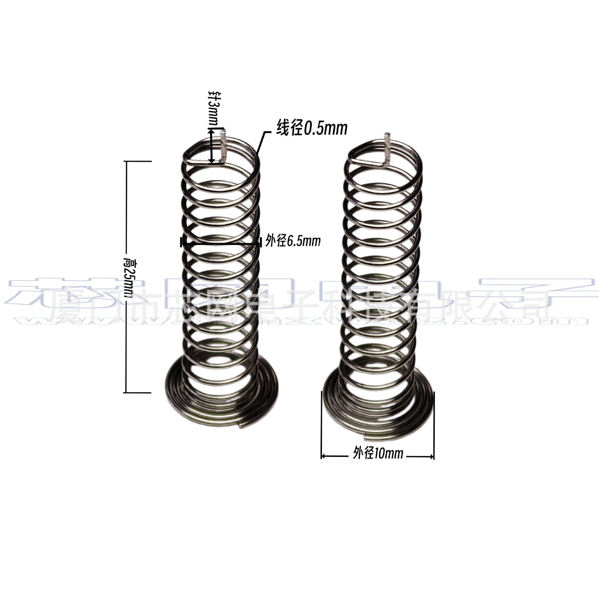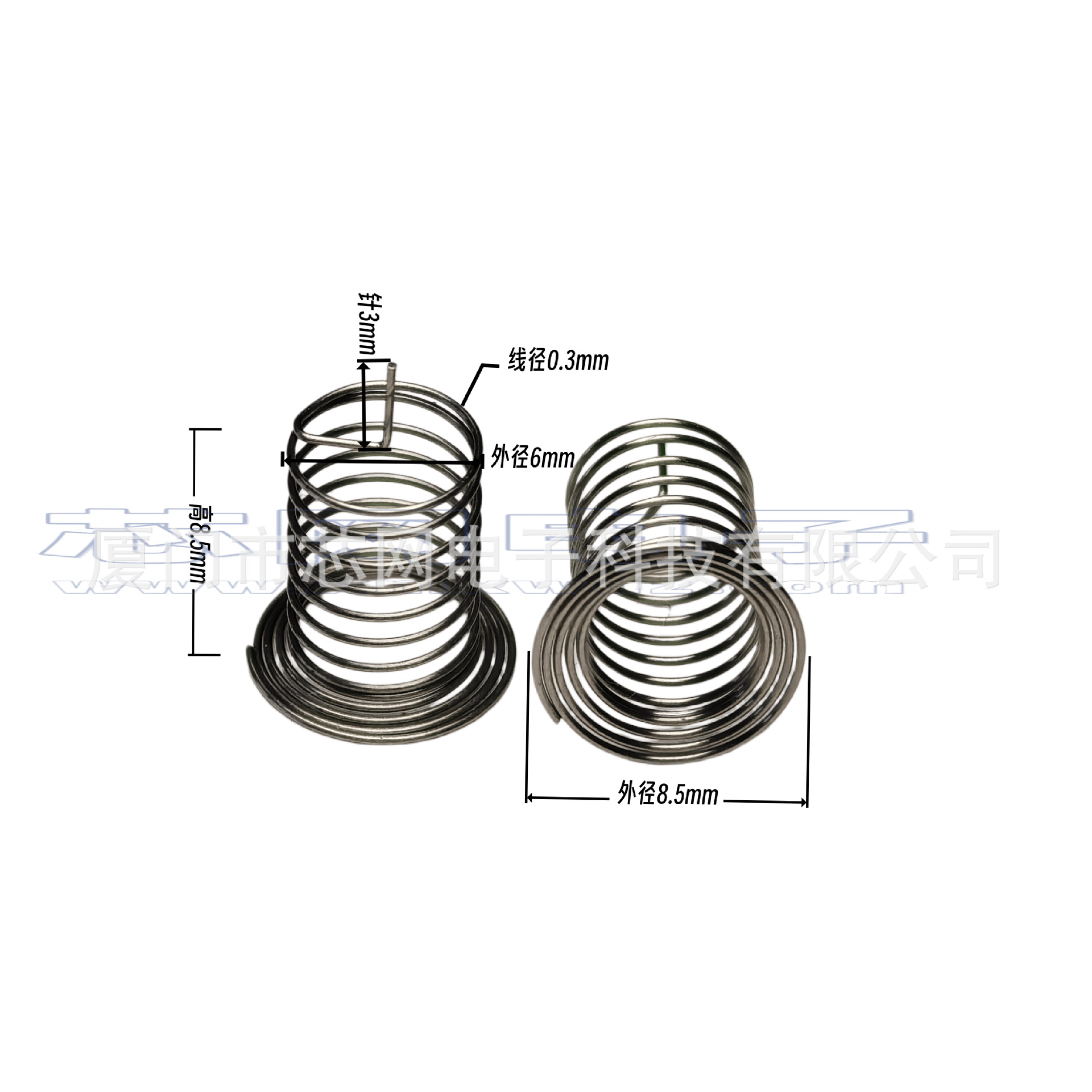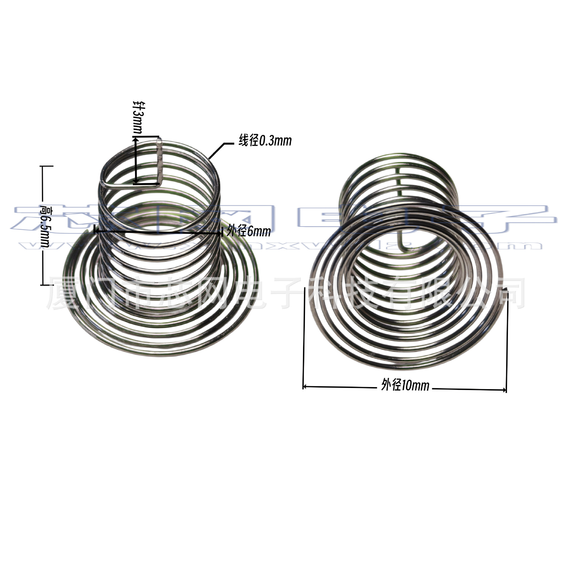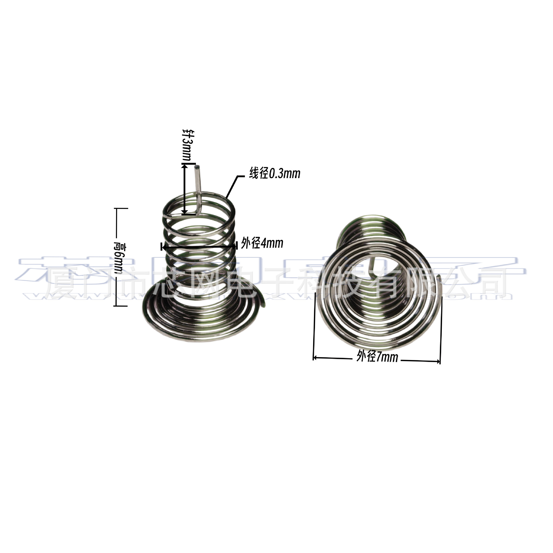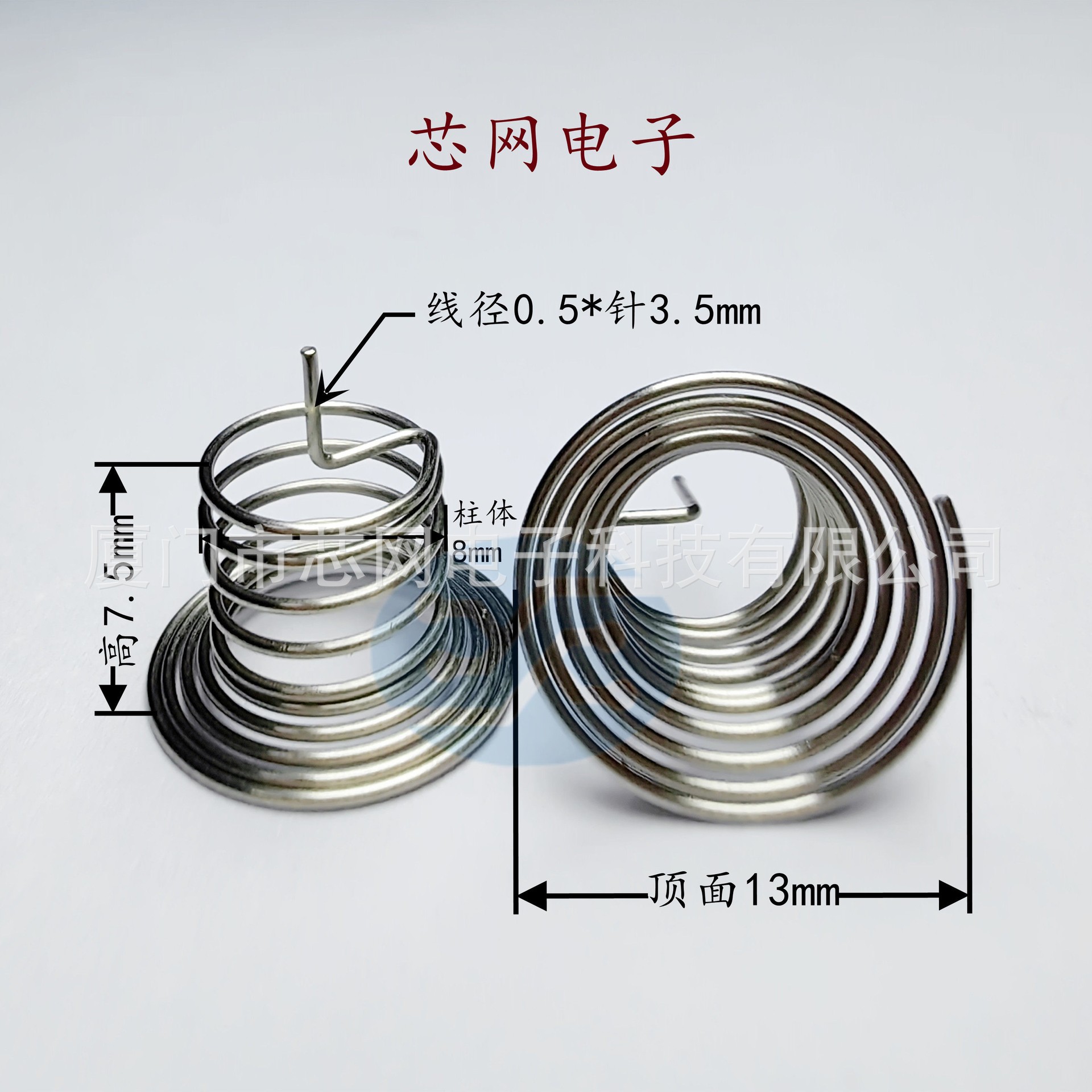 是指专用于电容式触摸芯片的专用弹簧按键。当小家电外壳跟pcba无法紧密贴合的时候,就需要通过导体来填补空间距离,目前主流应用中,触控弹簧是一个比较通用的选择,弹簧焊接于PCB上,同时可以比较稳定的接触触摸面板,使人手在触摸按键时, 触控芯片可以很好的检测到稳定的电容值变化。电容式触摸弹簧主要参数是顶面接触面大小(关系到是否足够穿透对应的外壳厚度,接触面越大灵敏度越高),以及高度(关系到是否可以跟外壳保证贴合)这两个参数。
