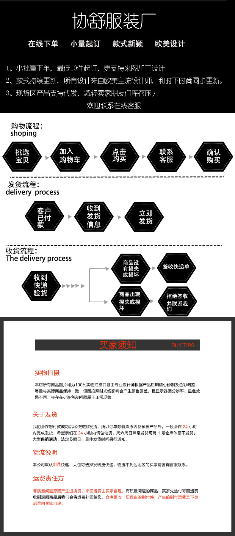 客户确认样品, 签定大货生产合同,客户付30%到60%定金,我司安排生产大货,大货(拍照或寄大货样客户确认或客户亲自验货),客户付清余款,我司安排发货