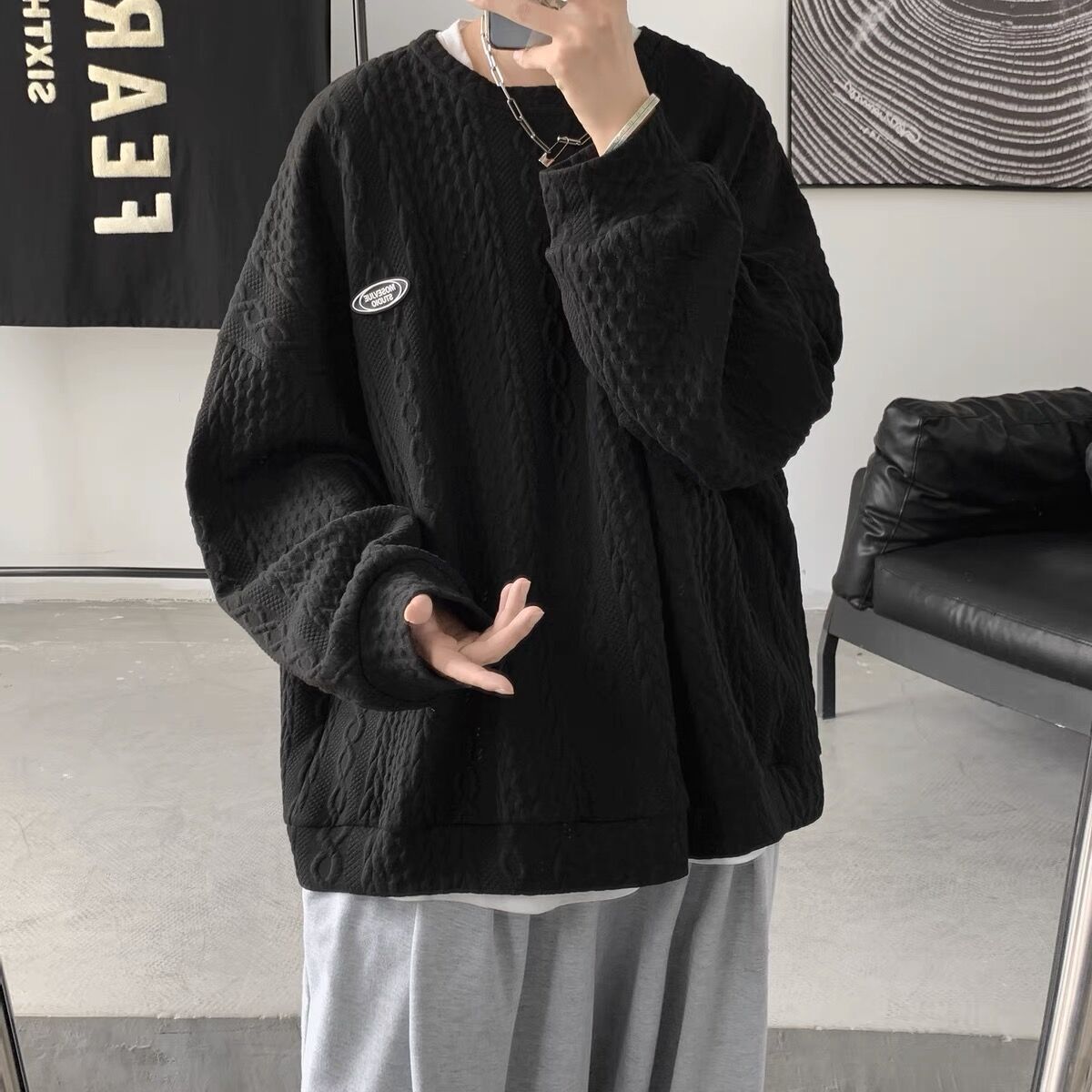 트위스트 입체 질감 운동복 남성용 in 홍콩 스타일 트렌디 브랜드 봄과 가을 느슨한 크루넥 디자인 센스 탑 커플 재킷스토어 가기