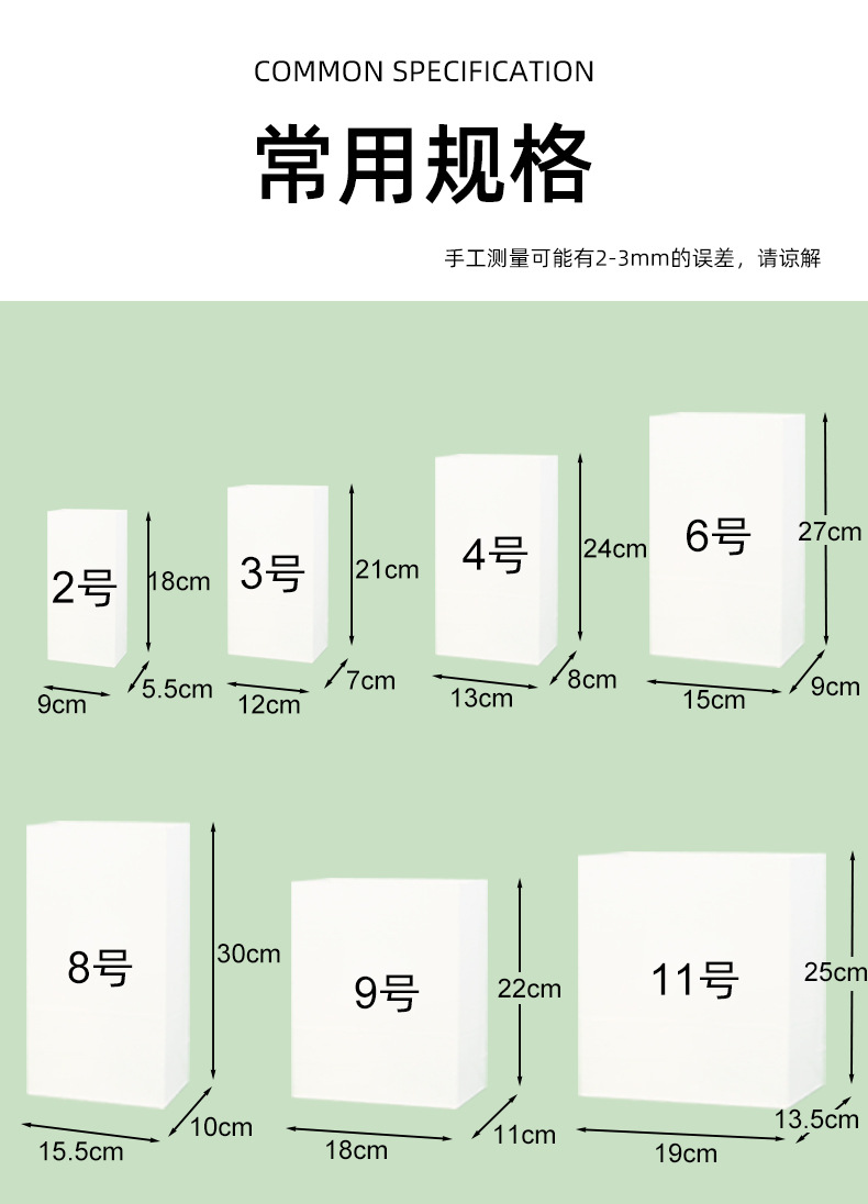 • 2 #: 너비 9 * 측면 5.5 높이 18cm;60g 흰색 소 가죽은 기름 방지가 아닙니다.