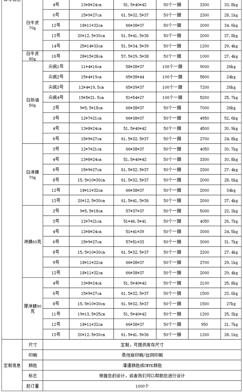 • 4 #: 너비 13 * 측면 8 높이 24cm;70g 흰색 소 가죽은 기름 증거가 아닙니다.