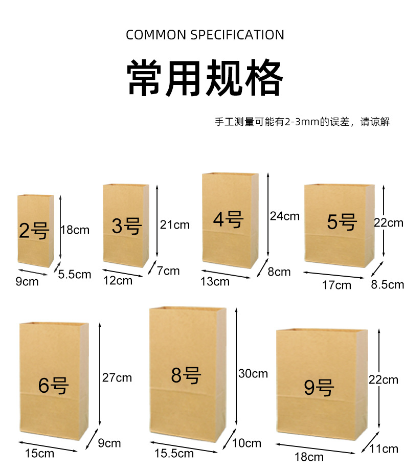 • 2 #: 너비 9 * 측면 5.5 높이 18cm;70g 노란색 소 가죽은 기름 방지가 아닙니다.