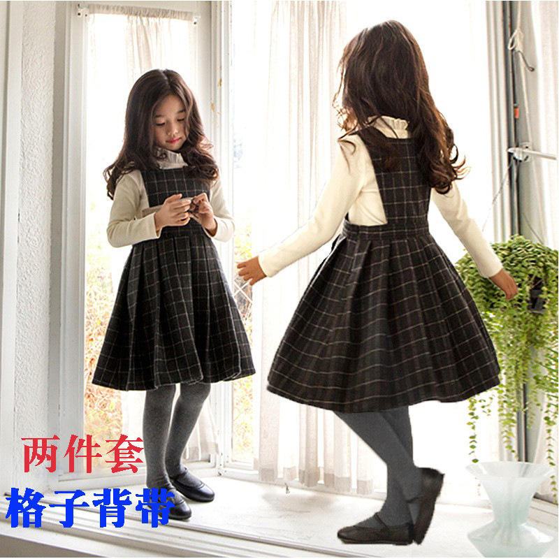2023 새로운 여아 격자 무늬 스트랩 두꺼운 원피스 칼라 면 투피스 세트 어린이 따뜻한 원피스스토어 가기