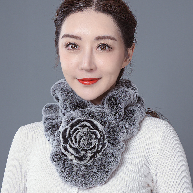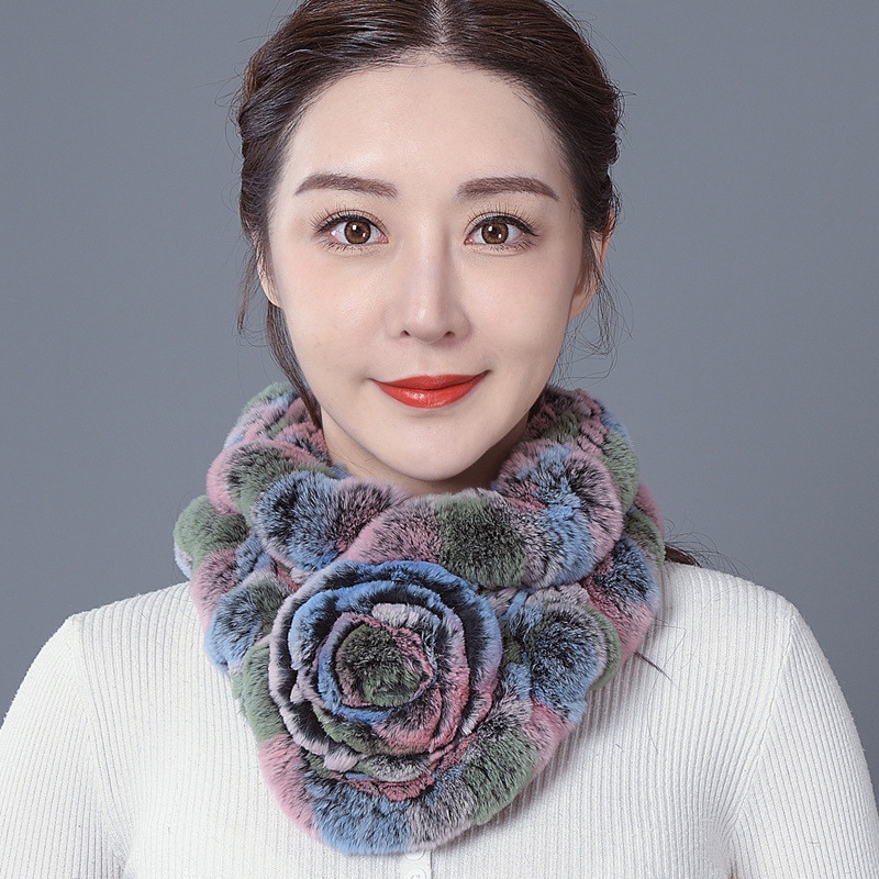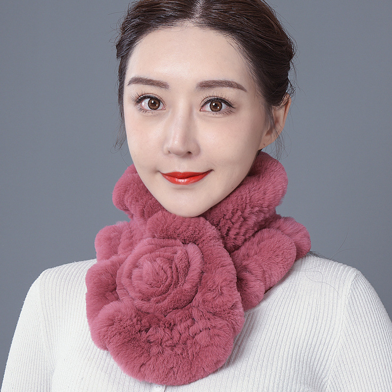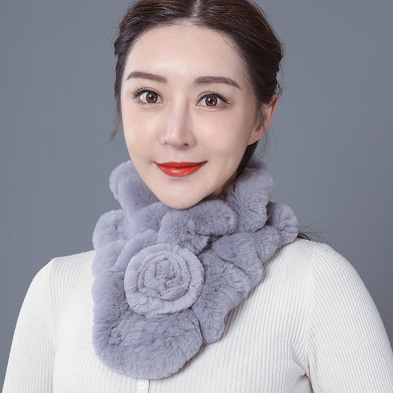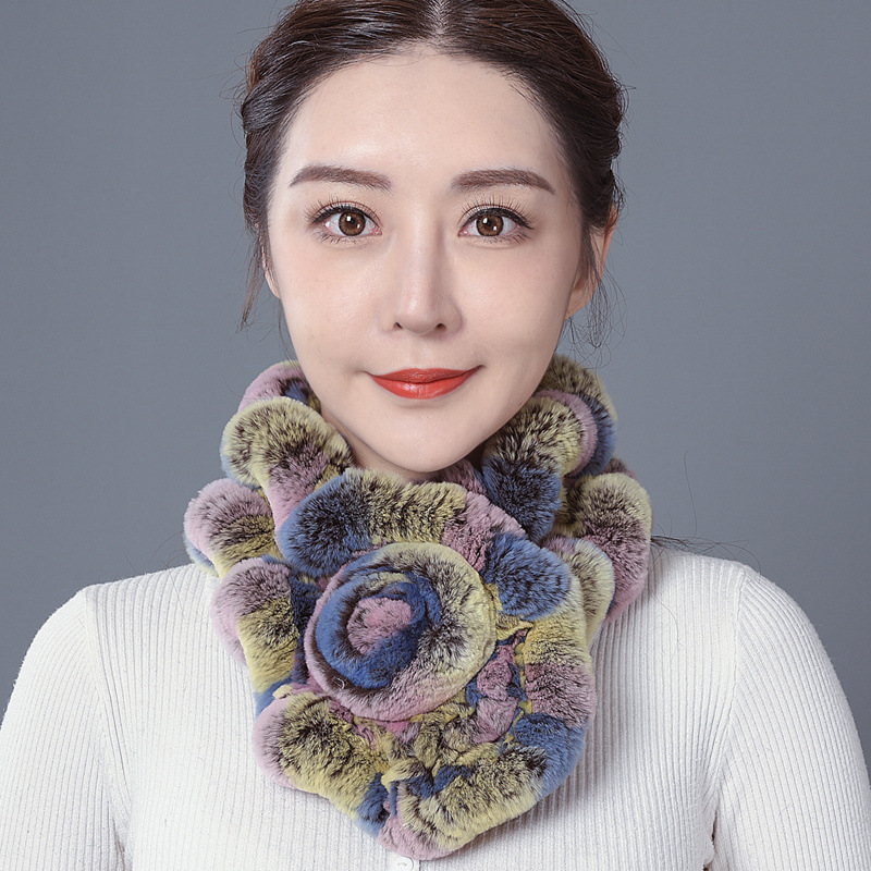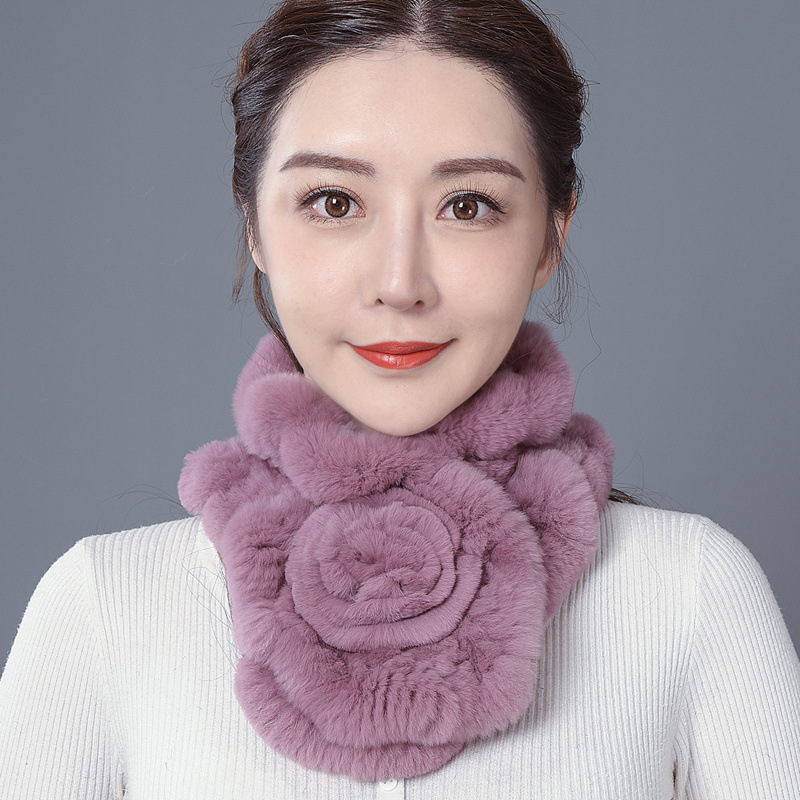 한국 스타일 모피 스카프 겨울 새로운 따뜻한 두꺼운 양면 렉스 토끼 모피 스카프 주름 귀 가장자리 여성 모피 칼라스토어 가기