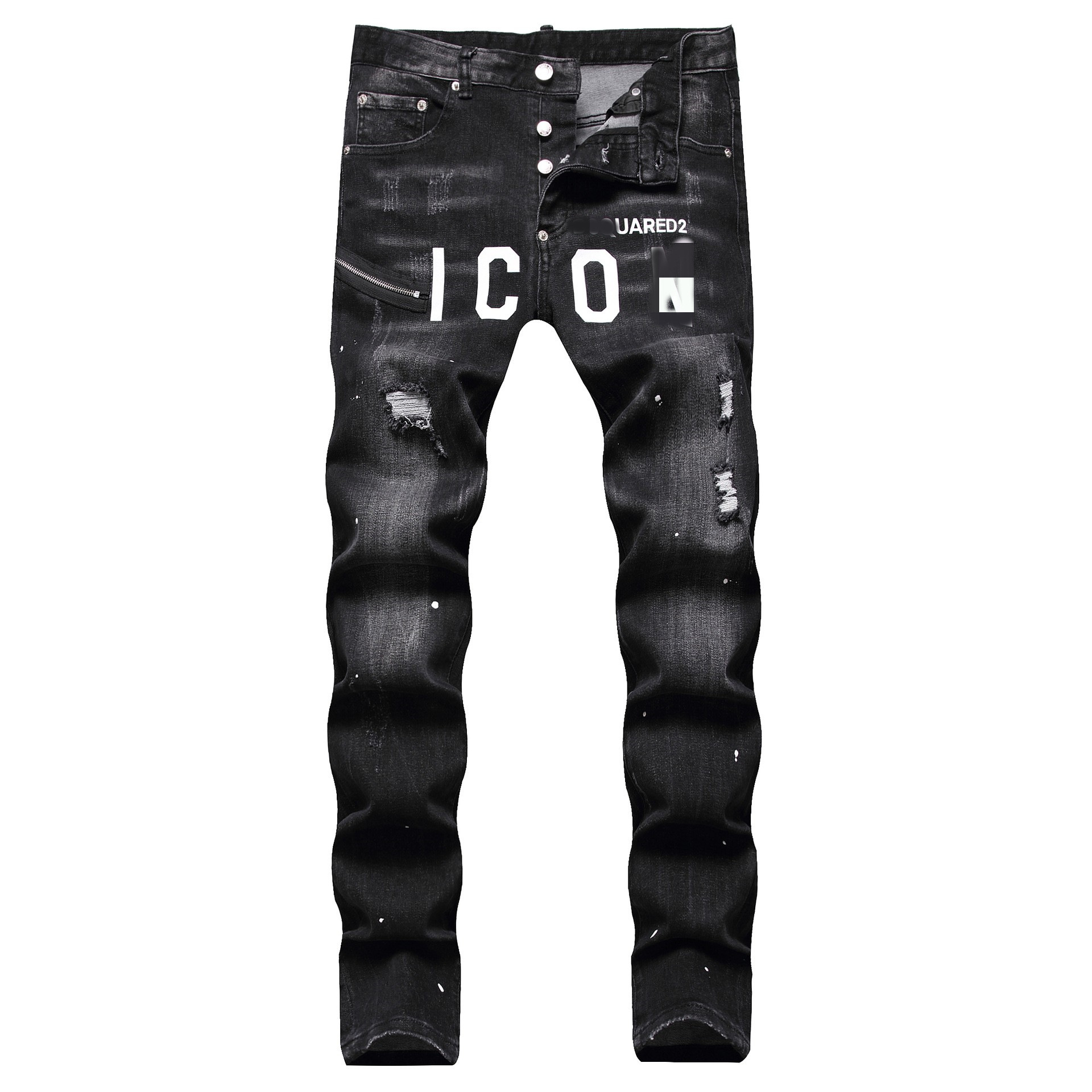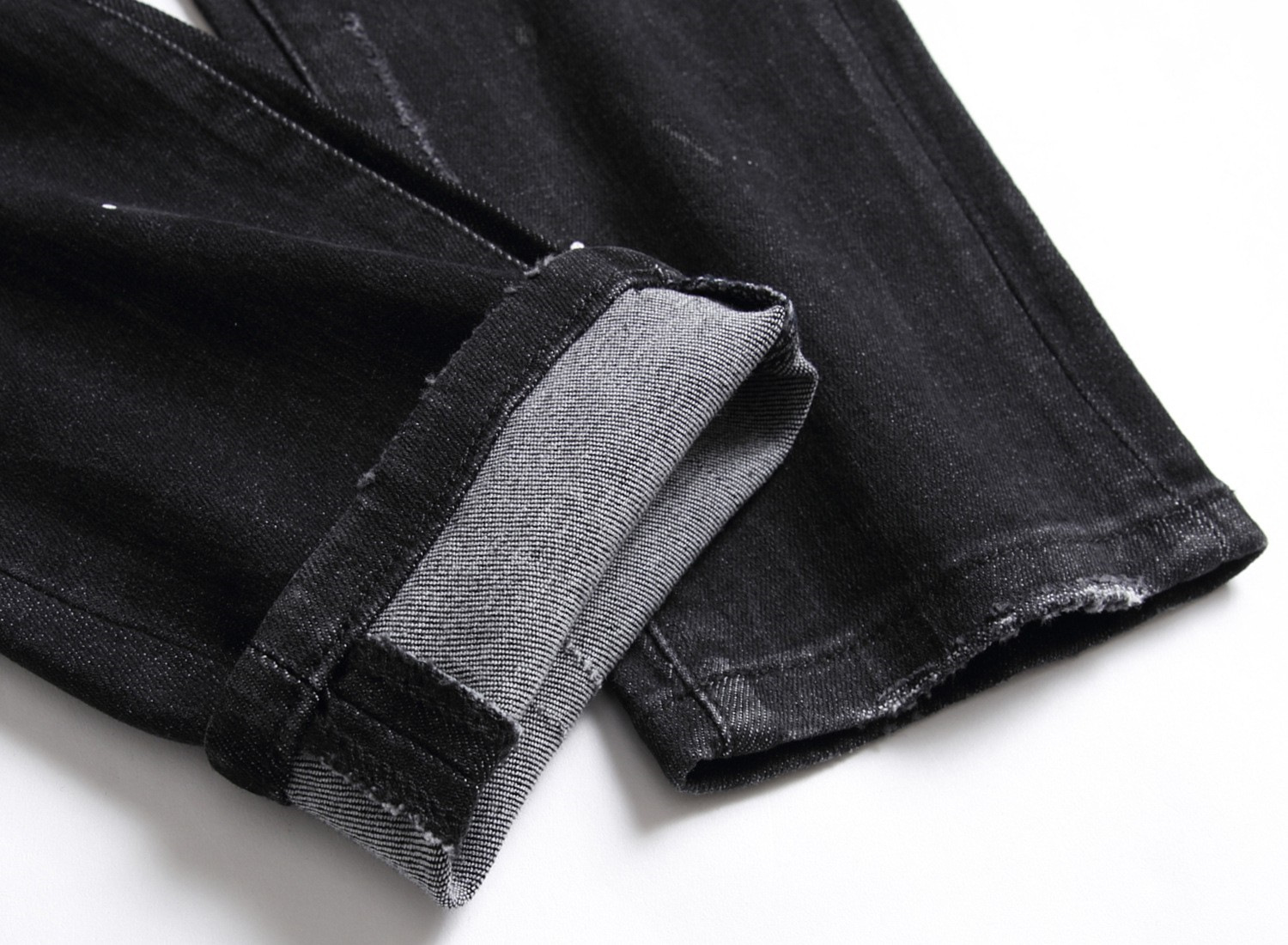 유럽과 미국 패션 브랜드 찢어진 자수 무질서한 라인 내부 지퍼 장식 디지털 컬러 인쇄 슬림핏 스트레치 청바지 남성