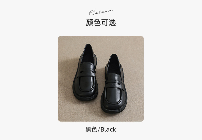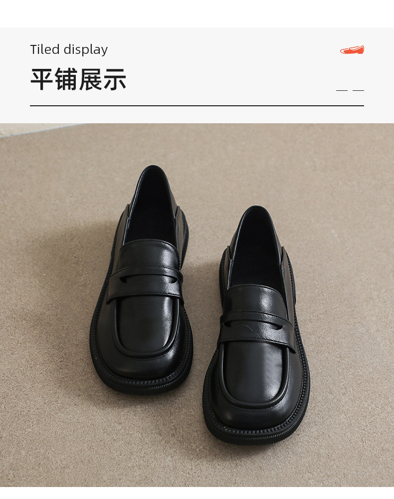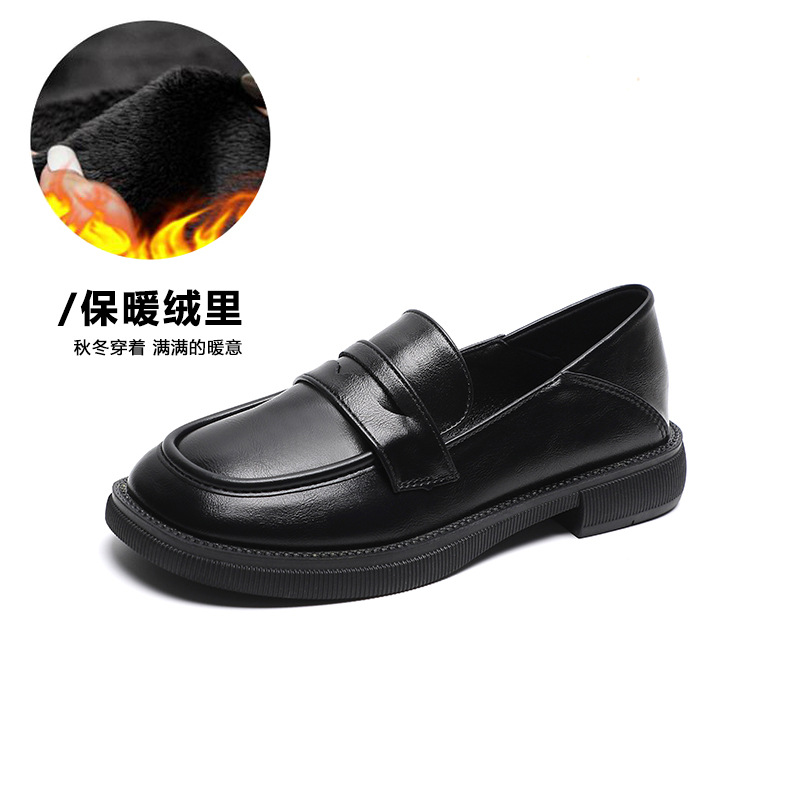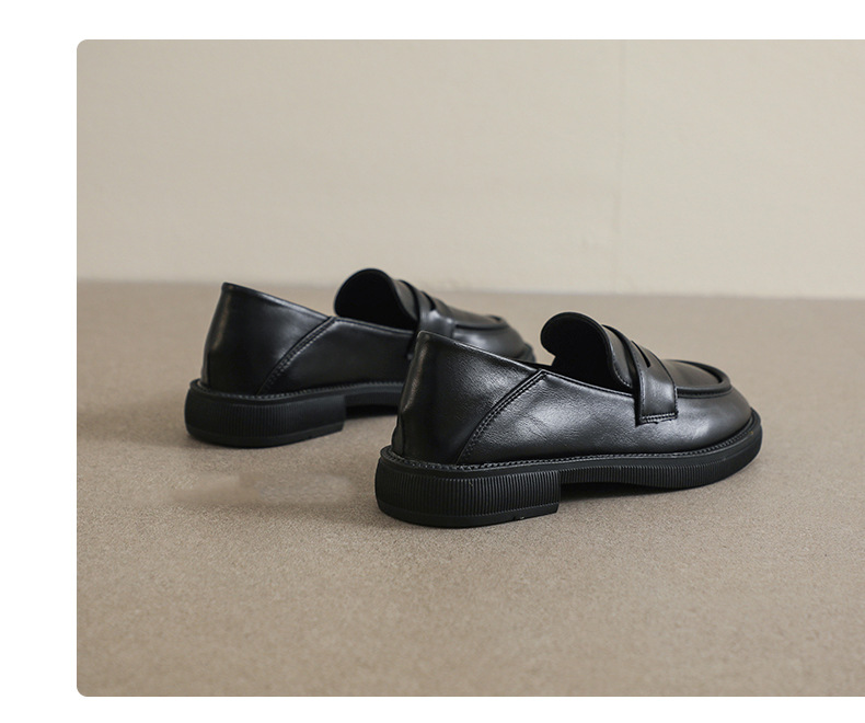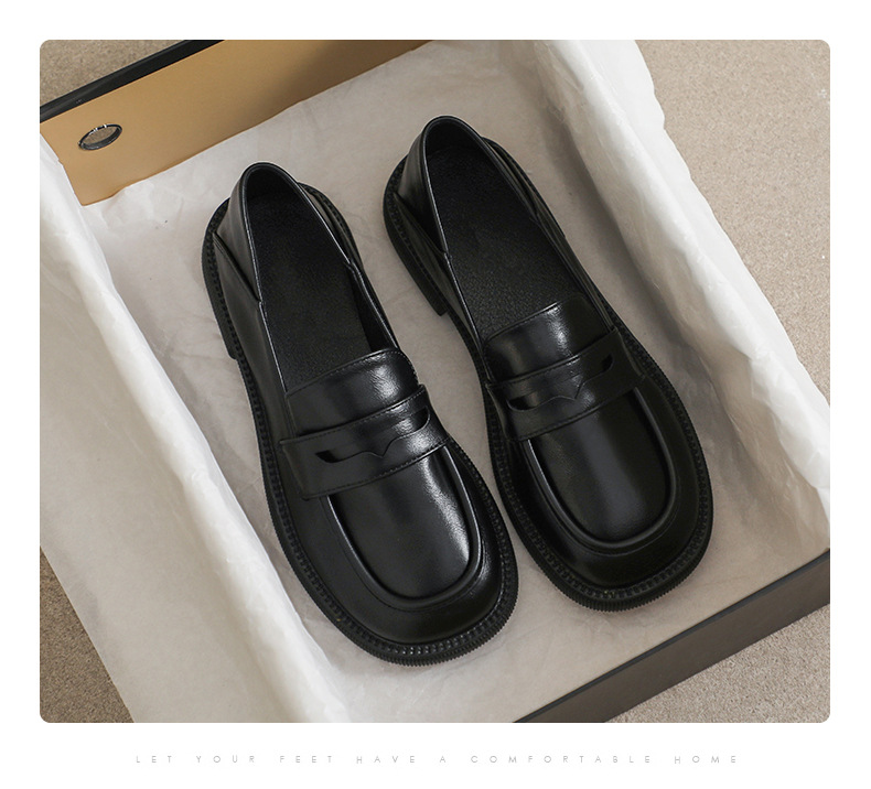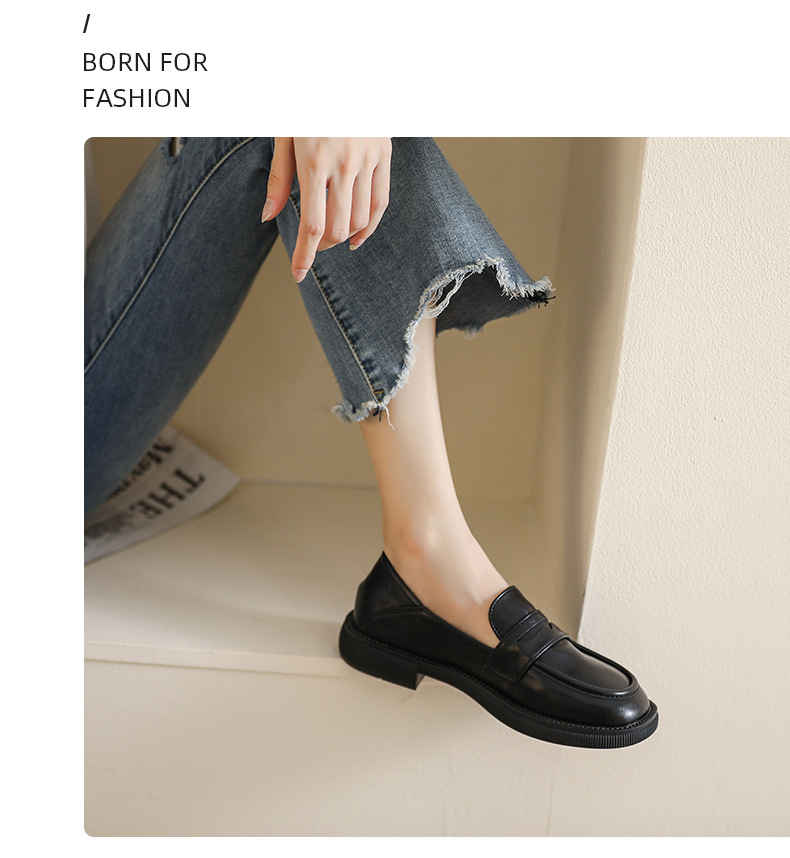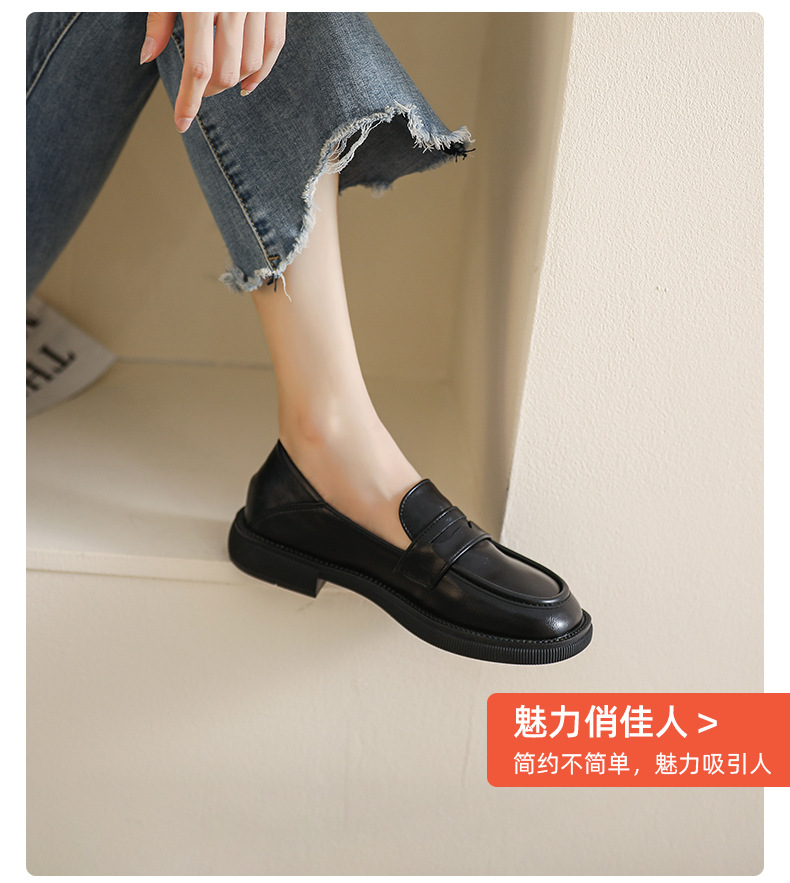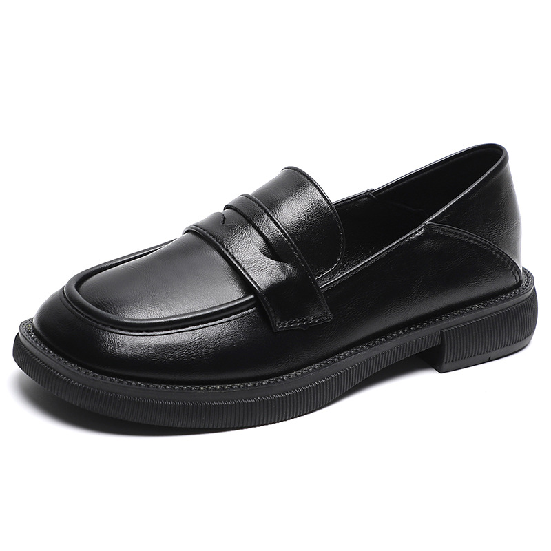 블랙 영국 작은 가죽 신발 여성 두꺼운 밑창 봄 2022 새로운 슬립 온 두꺼운 뒤꿈치 로퍼 라운드 발가락 2 착용 여성 신발스토어 가기