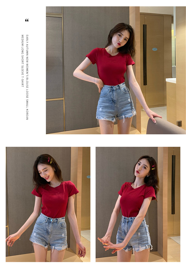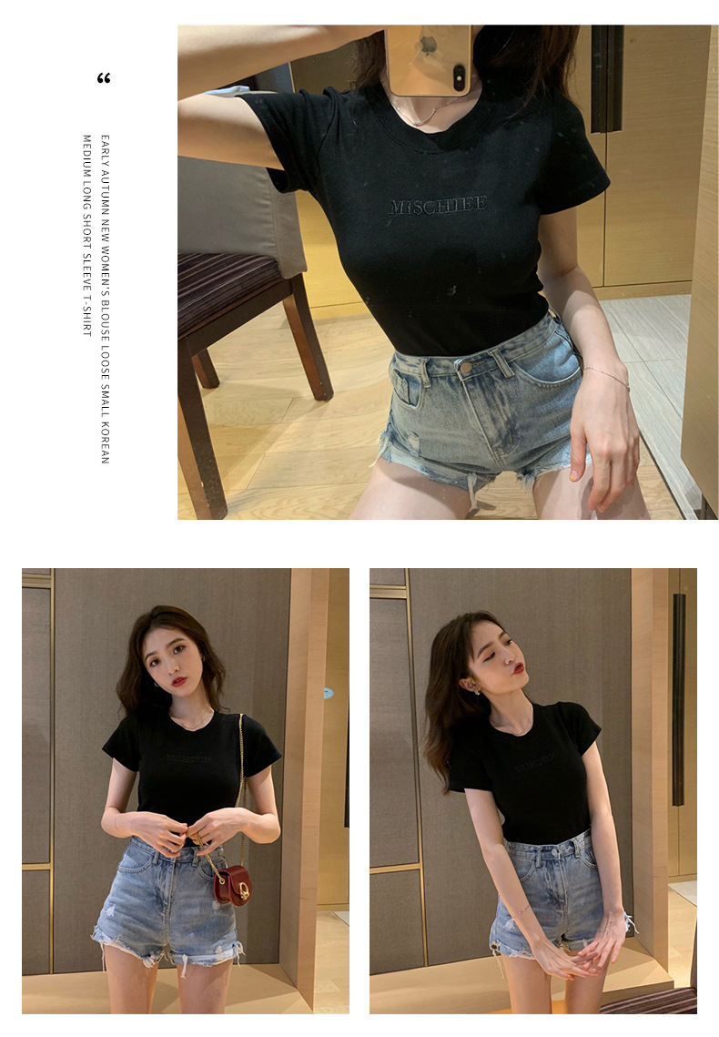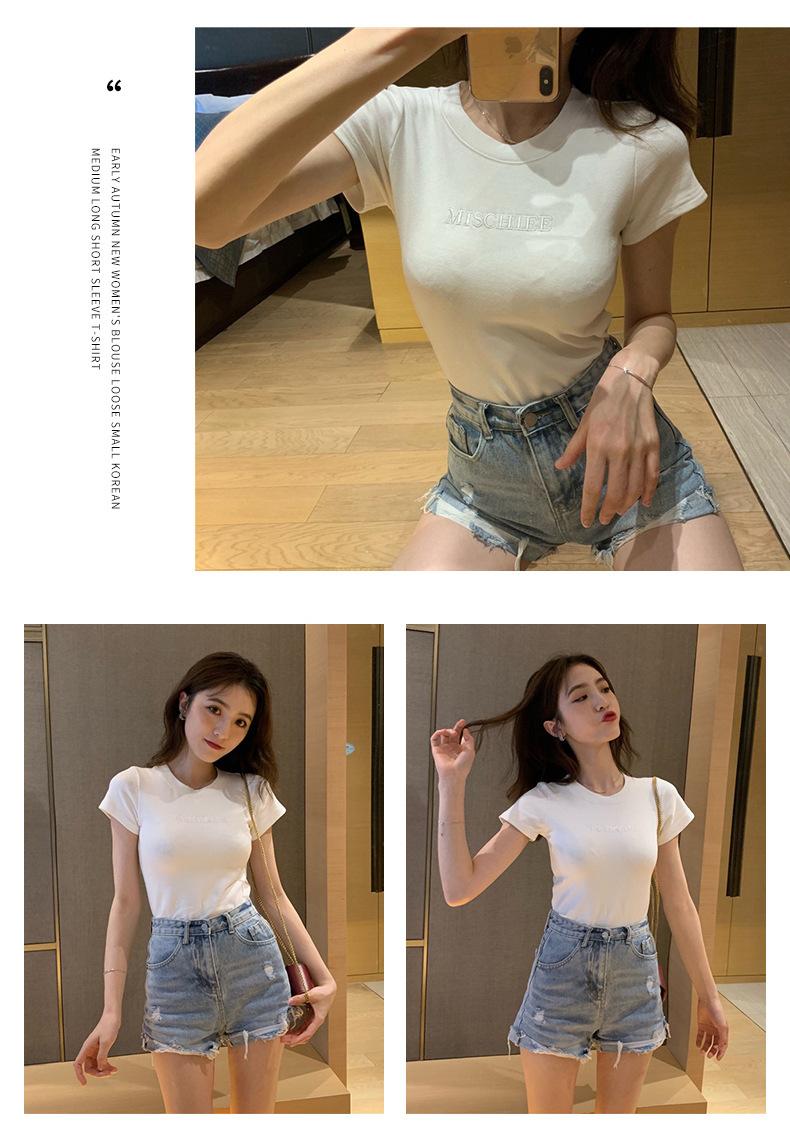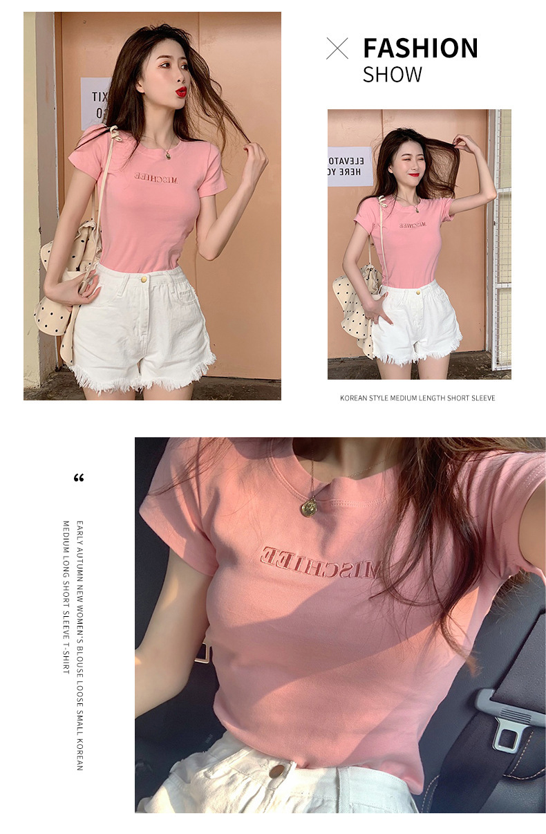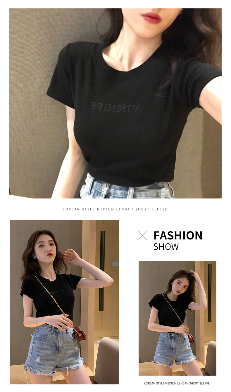 편지 자수 2021 여름 한국 새로운 반팔 티셔츠 여성 슬림 학생 의류 여성 최고 여성 도매스토어 가기
