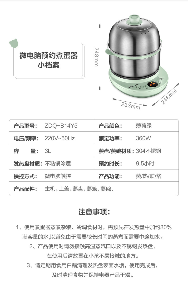 곰 계란 보일러 ZDQ-B14Y5 계란 찜기 정사이즈 예약 스테인레스 스틸 삶은 계란 더블 레이어 미니