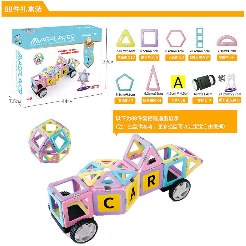 2.魔磁智慧片所选用是进口ABS塑胶,弹性良好。可组合出千变万化的造型积木(房屋建筑、交通工具、人物、动物,大型游乐园等)。