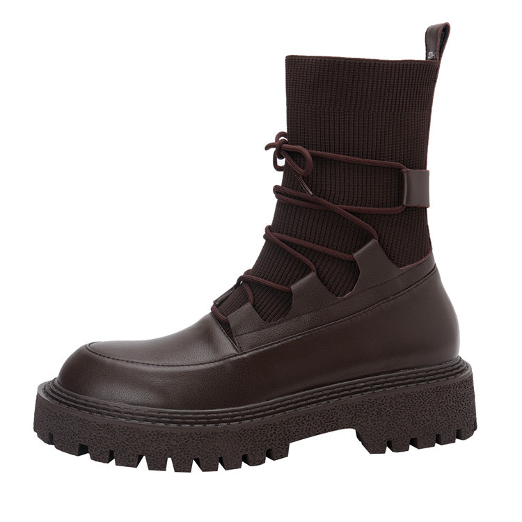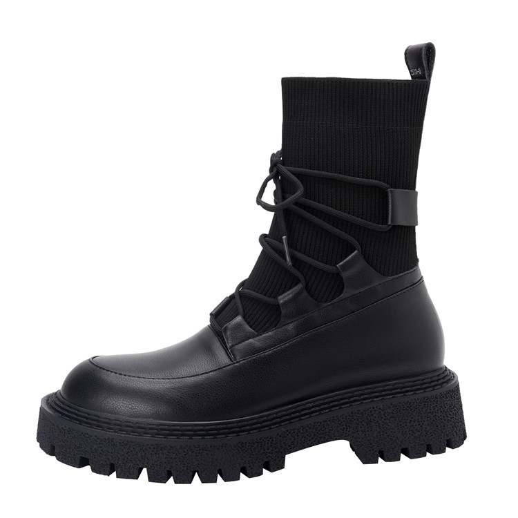 2024년 가을 여성용 부츠, 슬림핏 소가죽+플라이 니트 신축성 부츠, 라운드 토 양말 슈즈, 두꺼운 굽과 밑창의 마틴 부츠