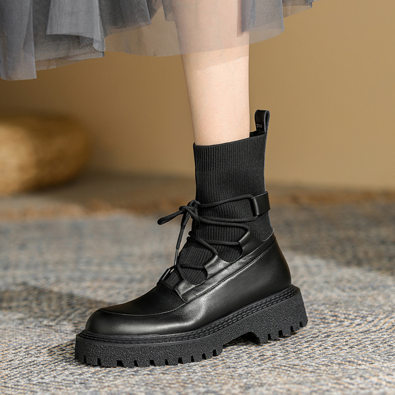 2024년 가을 여성용 부츠, 슬림핏 소가죽+플라이 니트 신축성 부츠, 라운드 토 양말 슈즈, 두꺼운 굽과 밑창의 마틴 부츠스토어 가기