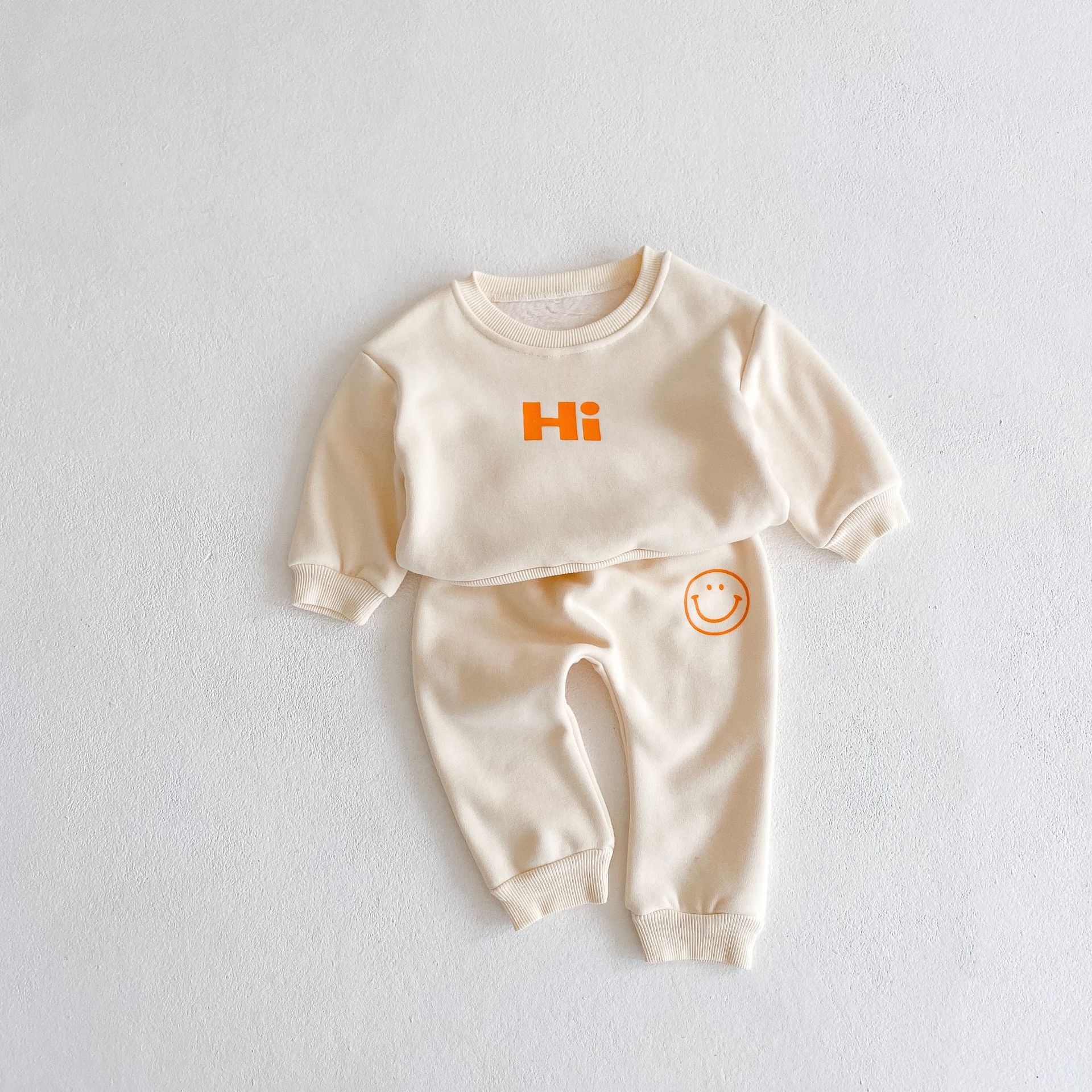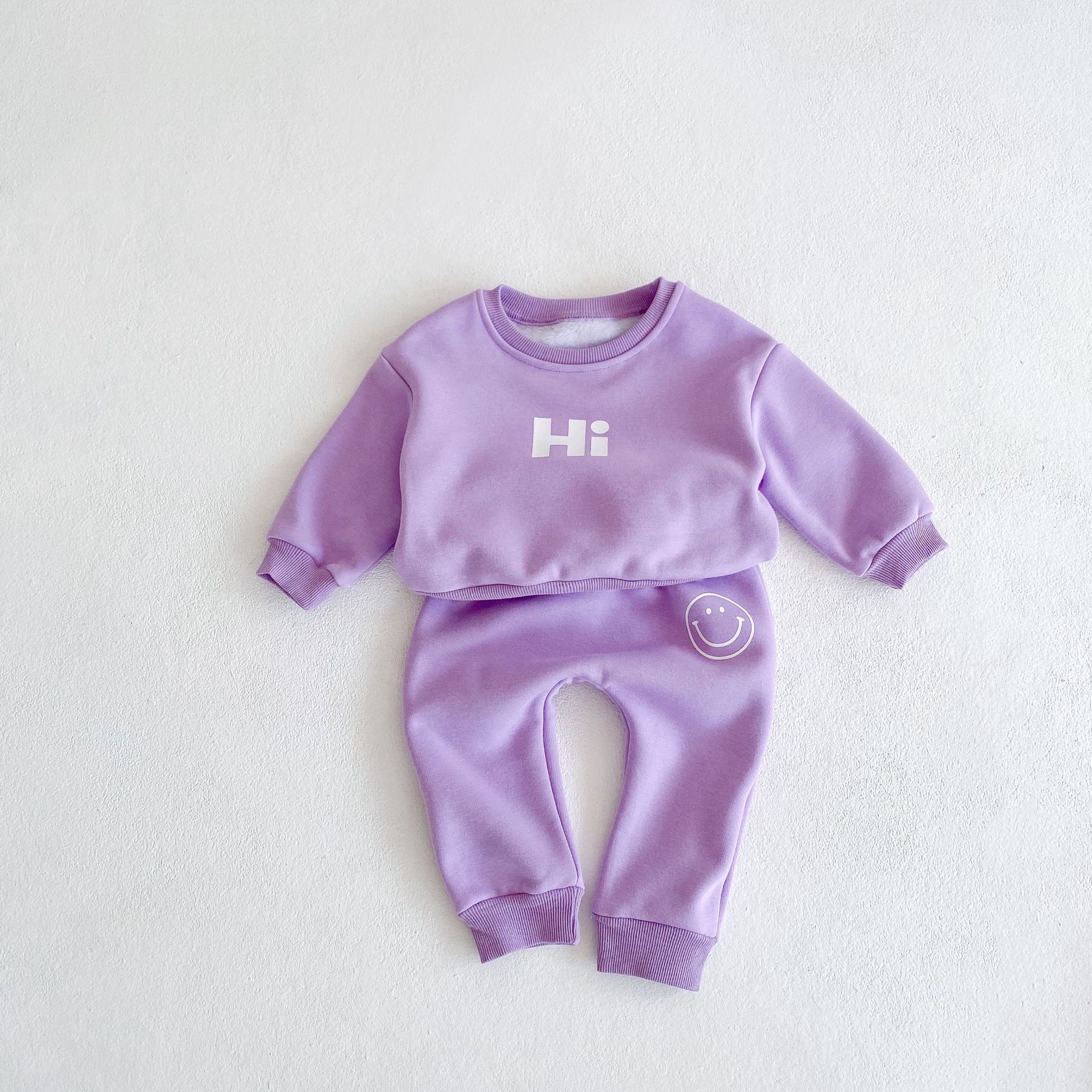 2025 가을 겨울 신상품 벨벳 안감 두꺼운 유아용 아기 웃는 얼굴 프린트 티셔츠 상의+바지 투피스 세트스토어 가기