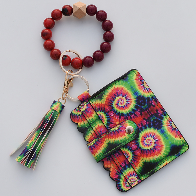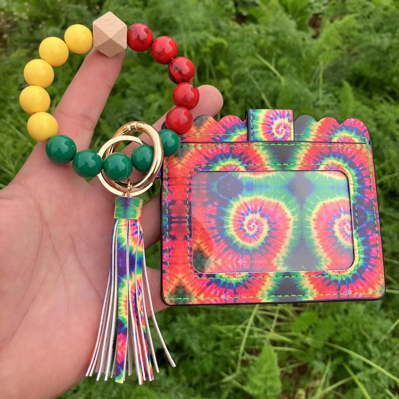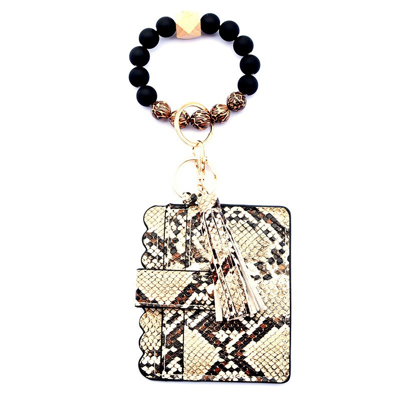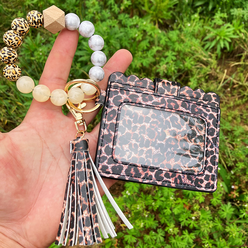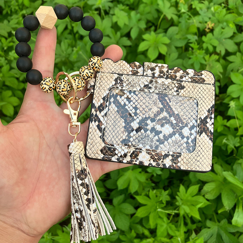 跨境PU豹纹蛇纹卡包彩色珠子手环女士零钱包公交卡套皮革流苏吊坠