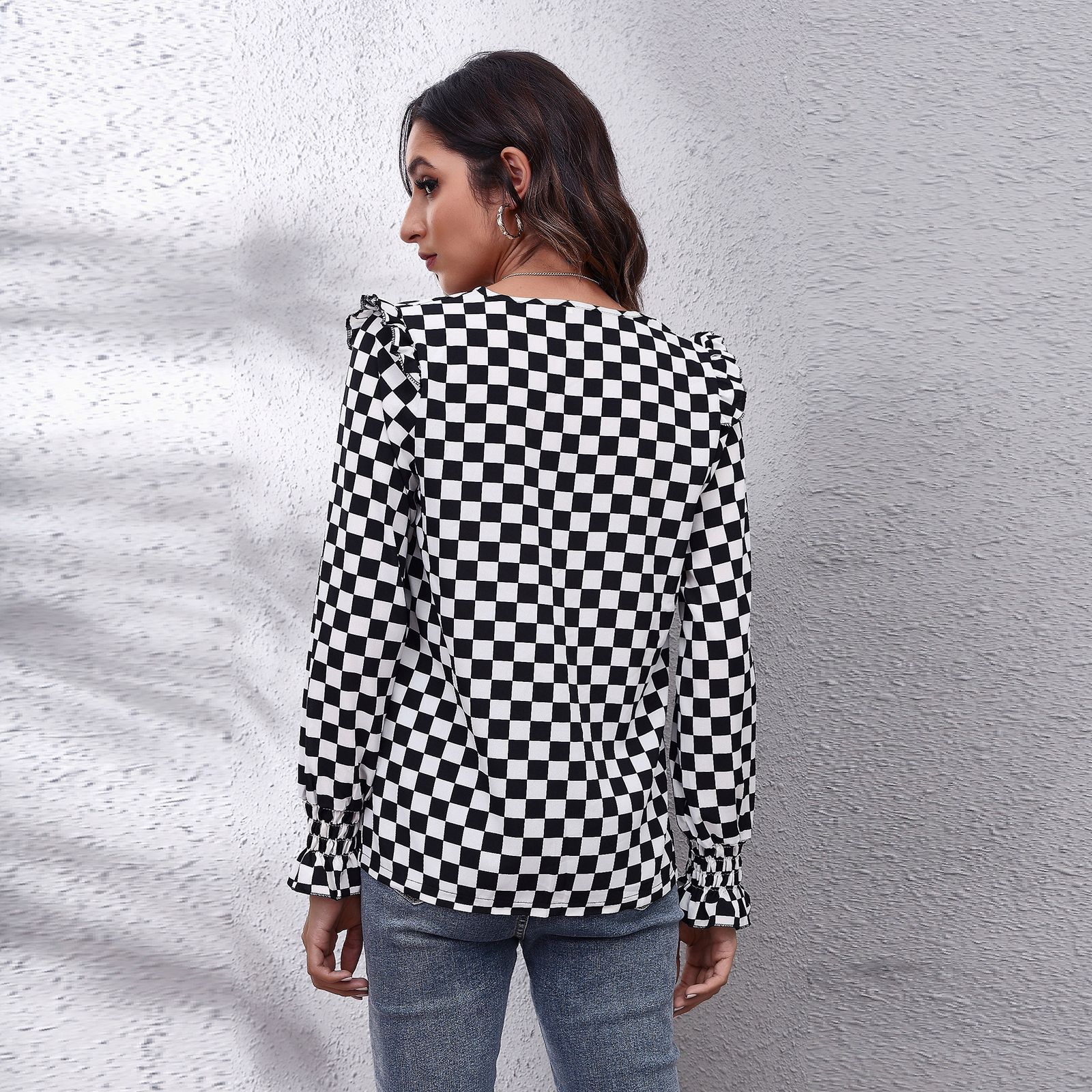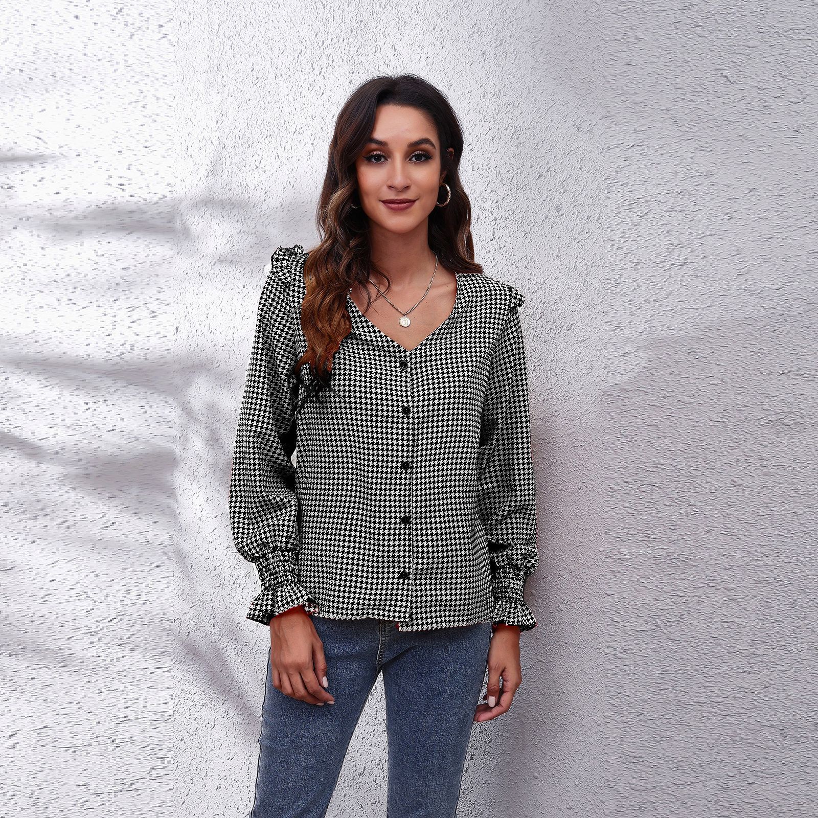 독립 역 폭발 실제 샷 Houndstooth 바둑판 계란 가장자리 V-넥 긴 소매 여성의 최고 새로운 격자 무늬 쉬폰 셔츠스토어 가기