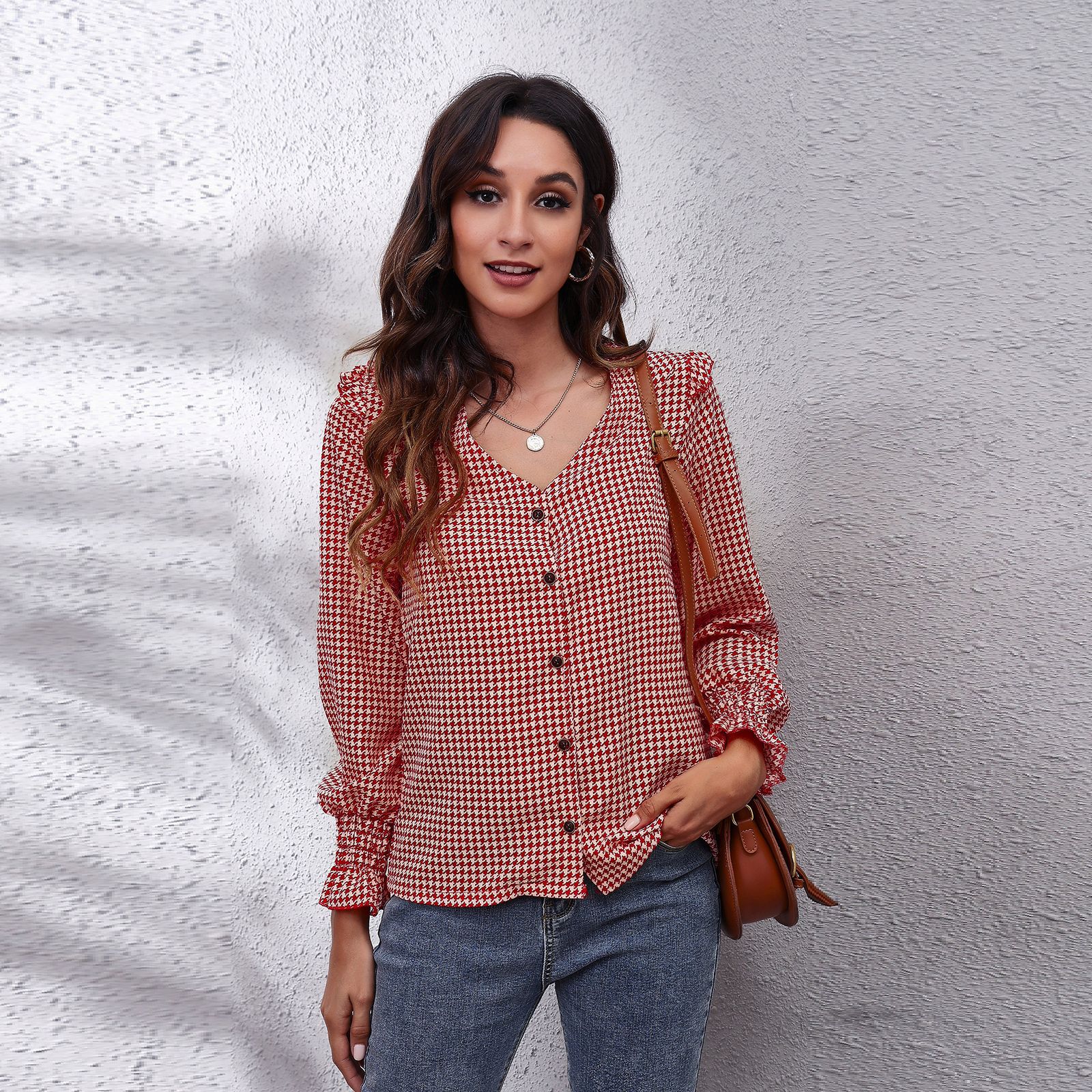 독립 역 폭발 실제 샷 Houndstooth 바둑판 계란 가장자리 V-넥 긴 소매 여성의 최고 새로운 격자 무늬 쉬폰 셔츠