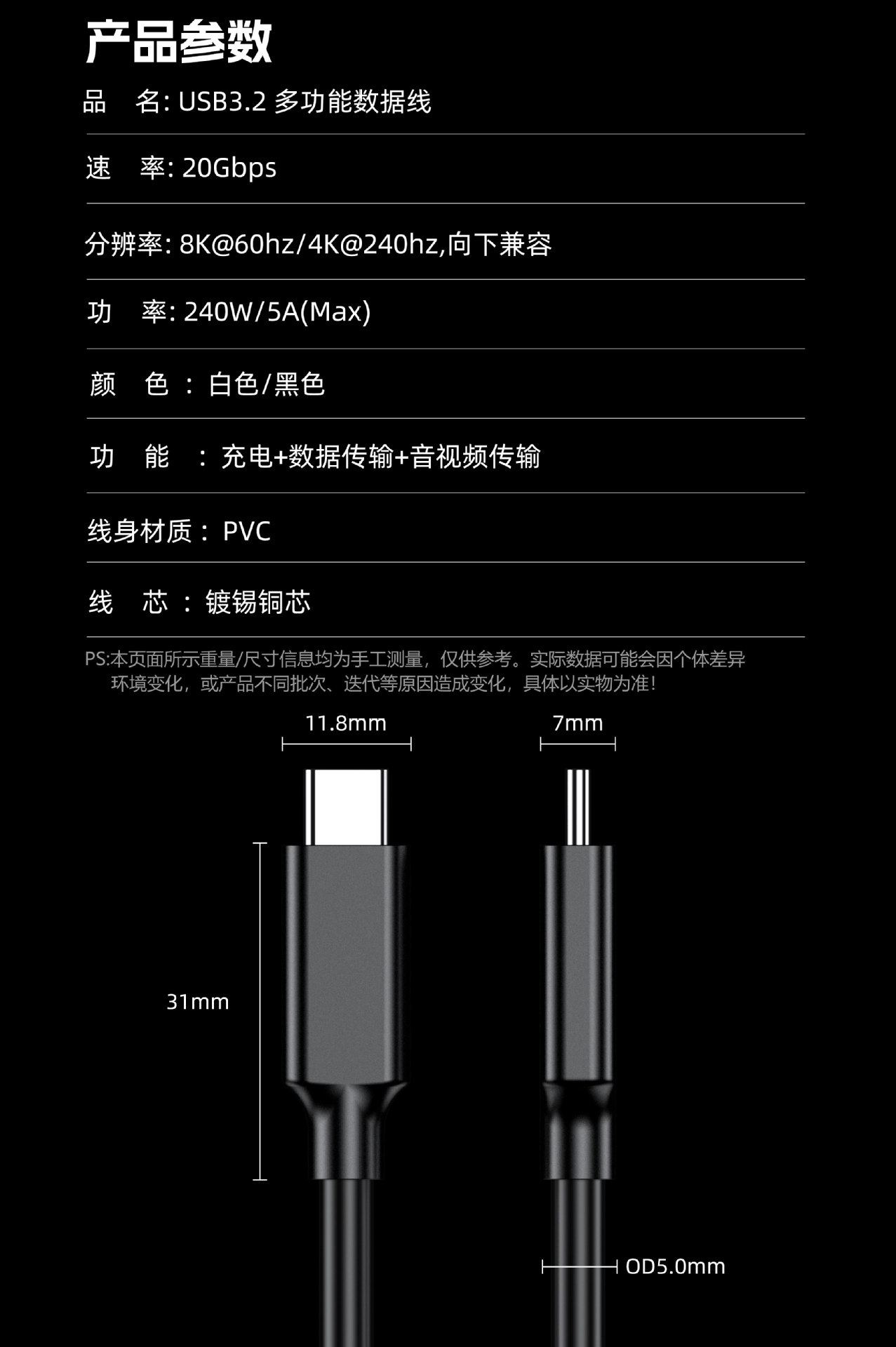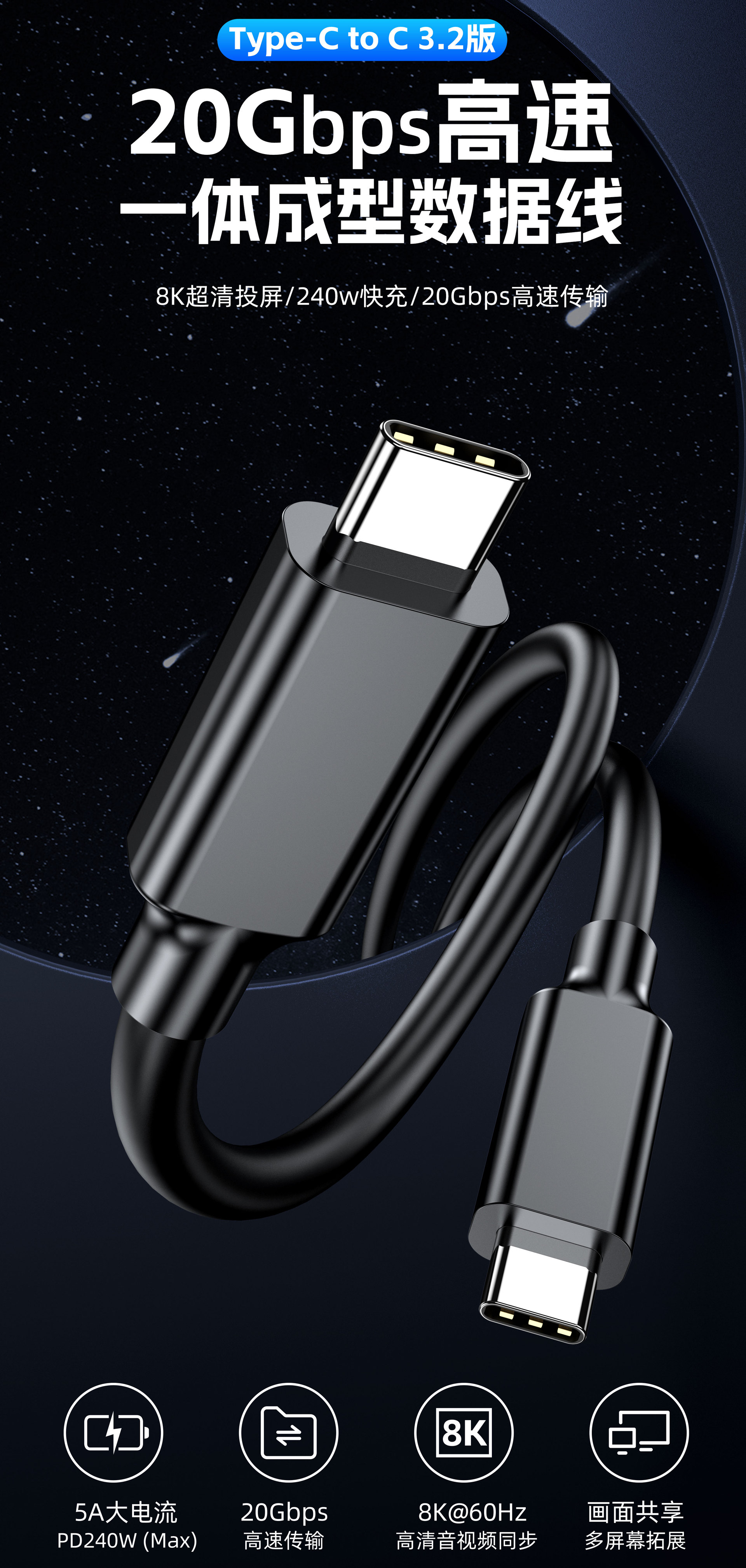 데이터 케이블 type-ctoc3.2 하드 디스크 케이블 20Gbps 고속 휴대용 스크린 케이블 8K 스크린 케이블 5a240w 고속 충전스토어 가기