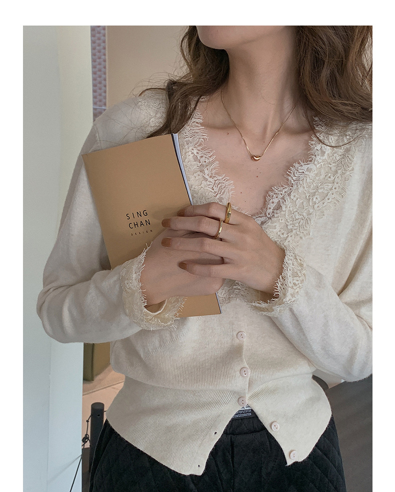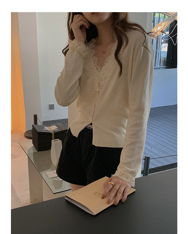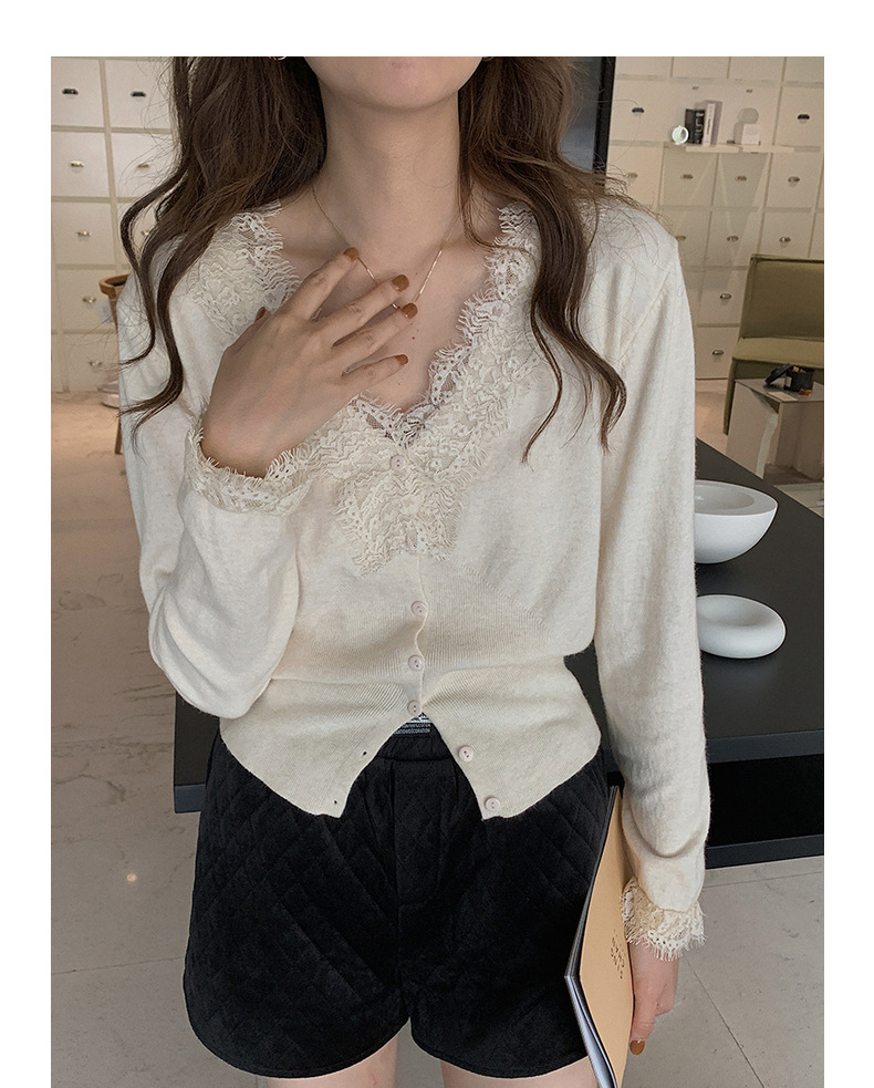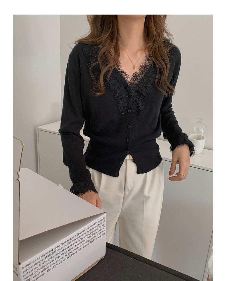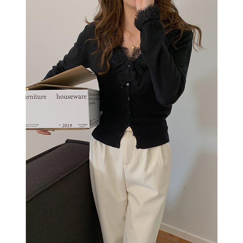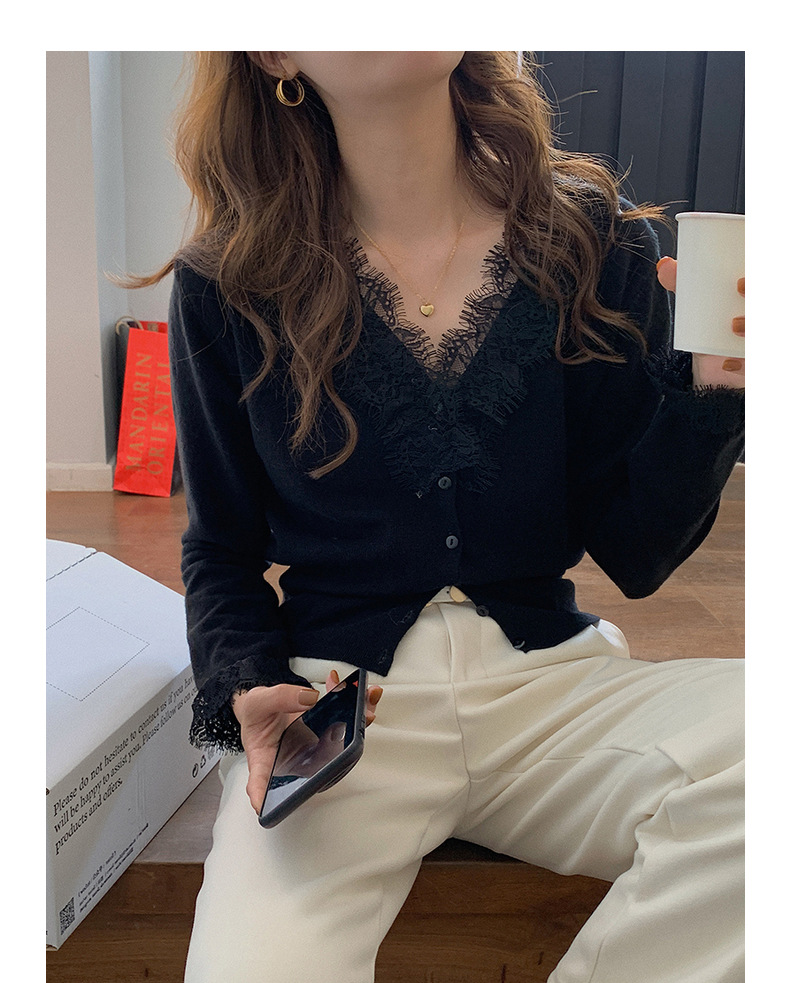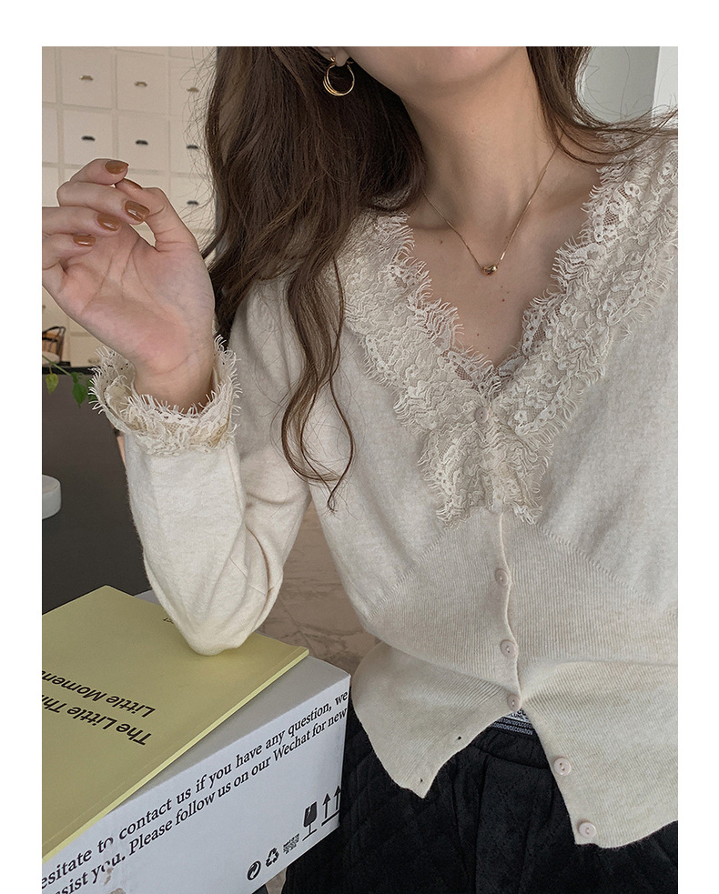 [송밍] 디자인 센스 니쉬 레이스 니트 카디건 여성 가을 새 V넥 슬림핏 우아한 탑 W797H