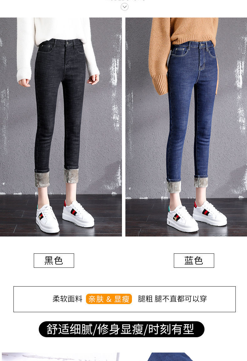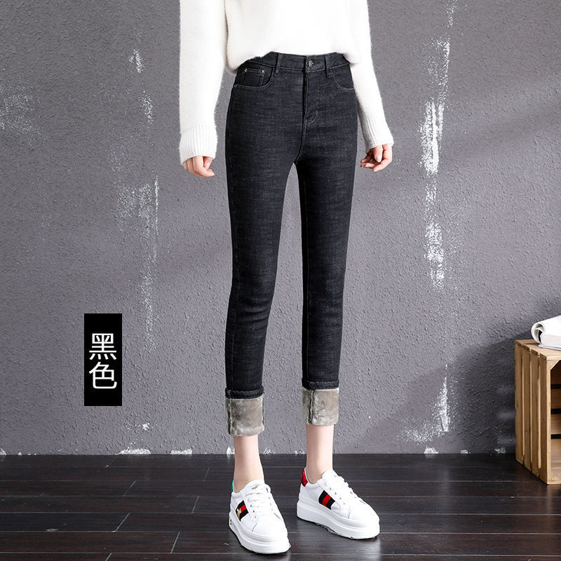 기모 고탄력 겨울 두꺼운 청바지 여성용 스키니 팬츠 하이 웨이스트 한국 스타일 슬림핏 슬리밍 따뜻한 바지 자르기