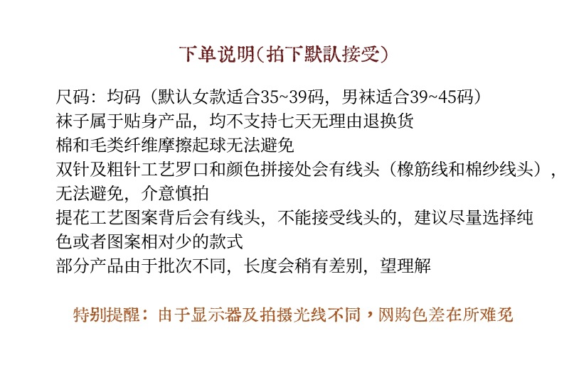 特别说明:双针袜罗口都有线头(棉纱线或者橡筋线外露的情况),这个是工艺决定的,非质量问题也无法避免,介意慎拍