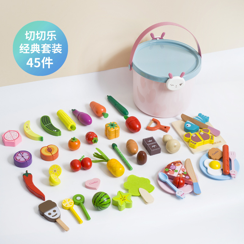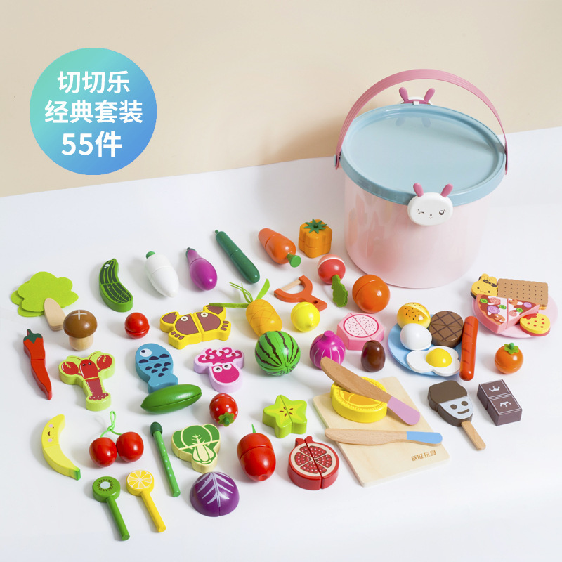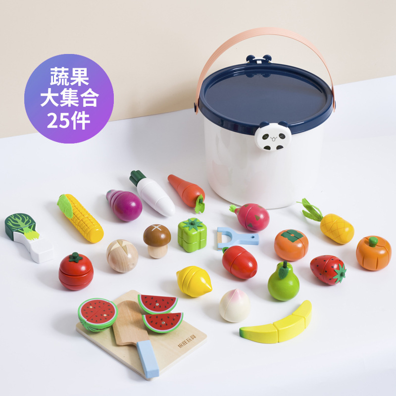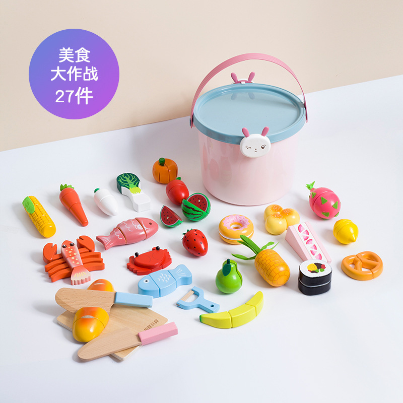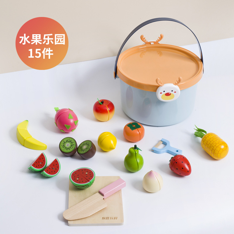 어린이 과일 치핑 장난감 피자 과일 야채 해산물 놀이 집 치핑 시계 휴대용 양동이 저장 세트