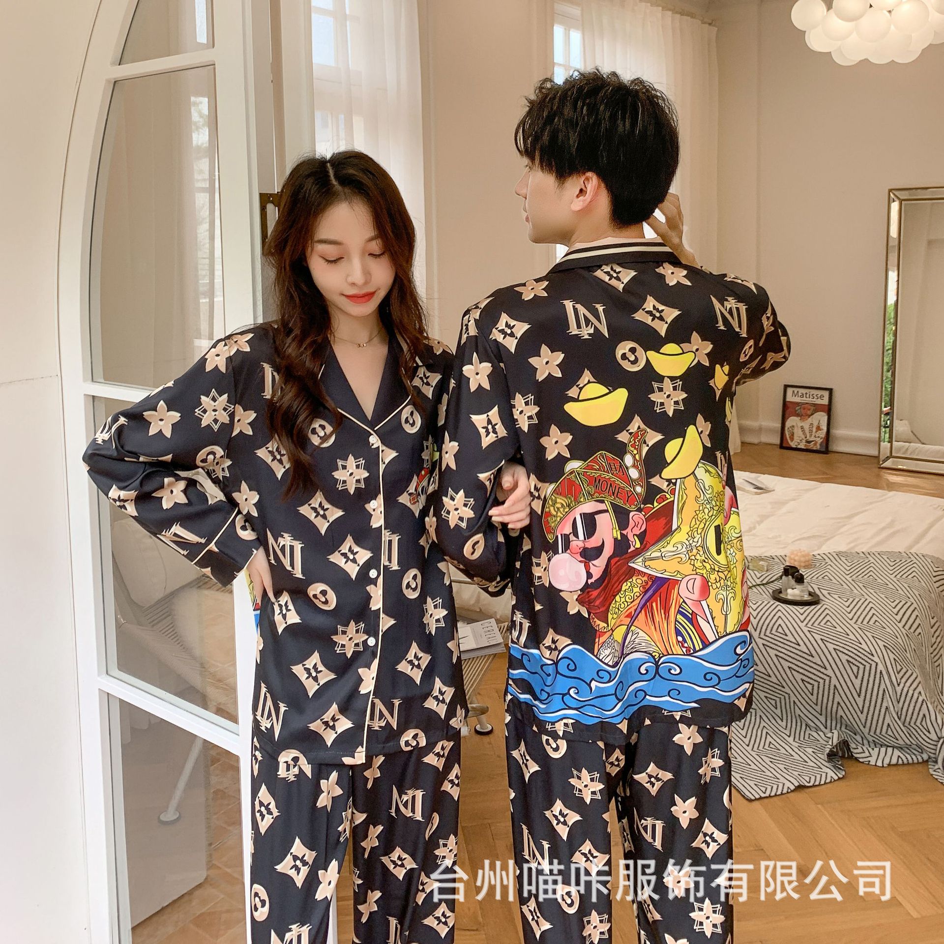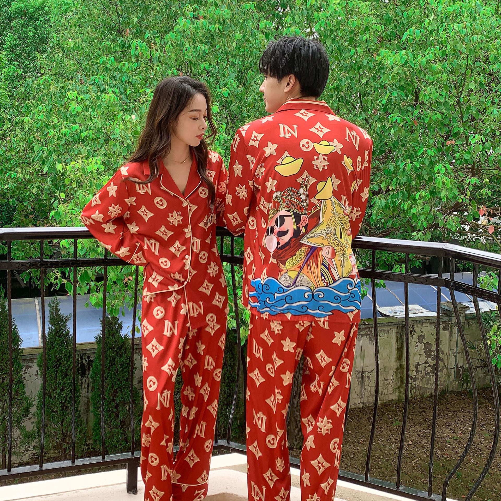봄과 가을 커플 잠옷 아이스 실크 패션 내셔널 패션 긴 소매 바지 투피스 세트 여성용 레드 웨딩 홈웨어 얇은스토어 가기